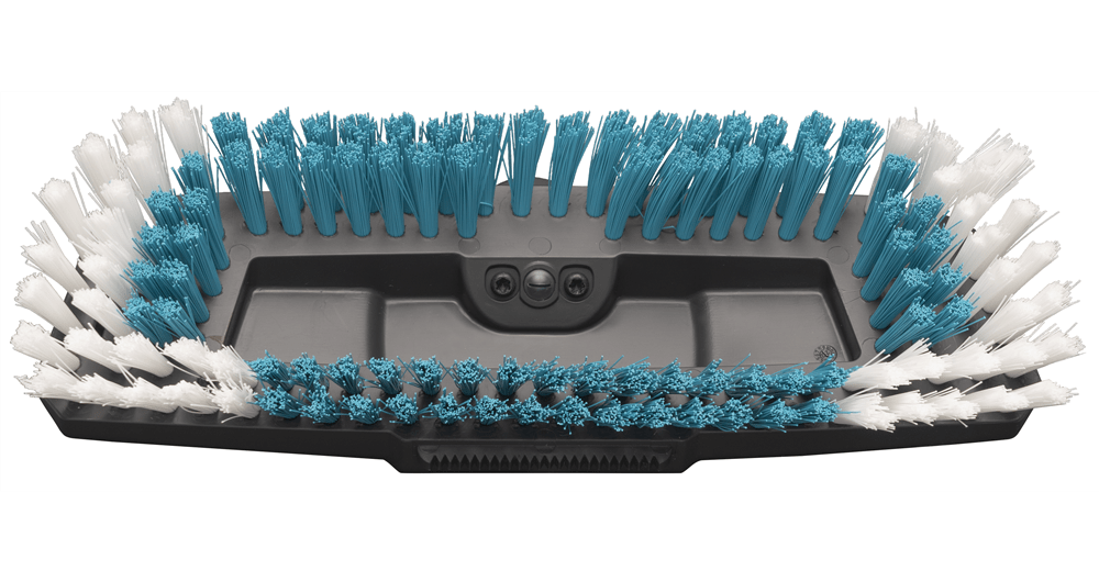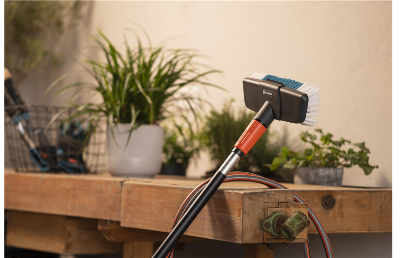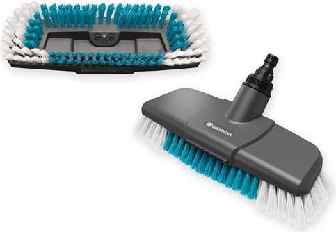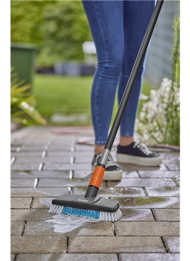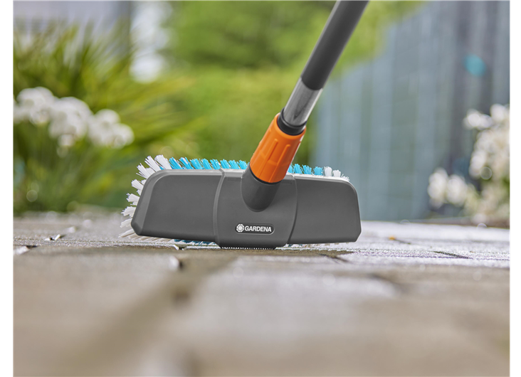 Die GARDENA Cleansystem Stielbürste hard ist für die kraftvolle Nassreinigung größerer, unempfindlicher Flächen wie z. B. Garageneinfahrten geeignet.Gründliche und effektive Nassreinigung größerer robuster AußenflächenFür eine gründliche Flächenreinigung im Handumdrehen einfach die Cleansystem Stielbürste hard mit einem Cleansystem Stiel verbinden und an den Gartenschlauch anstecken. Terrasse, Hof oder Einfahrt lassen sich schnell und problemlos damit reinigen. Die Anwendung bei vielfältigen Reinigungsarbeiten auf Großflächen rund ums Haus ist denkbar einfach und das Ergebnis kann sich sehen lassen.Schrubber zur intensiven Reinigung unempfindlicher OberflächenDie harten Borsten mit unterschiedlichen Borstenlängen wurden speziell für alle unempfindlicheren Flächen im Außenbereich entwickelt. Die gründliche Reinigung großer robuster Flächen gelingt damit optimal - egal, ob es sich um Garageneinfahrten, Wege oder Innenhöfe handelt. Mit der wasserführenden harten Bürste lässt sich grober und hartnäckiger Schmutz im Handumdrehen entfernen.Effizient und flexibel dank unterschiedlicher BorstenlängenEine Besonderheit der robusten Stielbürste sind die unterschiedlichen Borstenlängen. Damit lassen sich unebene Bodenflächen, Fugen und Pflastervertiefungen, die für herkömmliche Bürsten schwer zugänglich sind, gründlich reinigen. Die spezielle Flachstrahldüse und die Kratzkante zum Lösen hartnäckiger Verschmutzungen ermöglichen eine effektive Reinigung.Optimales Zusammenspiel mit den GARDENA Cleansystem Stielen und ReinigungstabsIn Kombination mit den wasserführenden Stielen (Art. 18800, 18802, 18804) wird eine besonders intensive Anwendung auf robusten Oberflächen ermöglicht. Mit der Verwendung des GARDENA Shampoos (Art. 1680) wird die Effizienz der Stielbürste noch gesteigert. Sie können einfach in den Spender am Stiel eingesetzt werden und lassen sich je nach Bedarf dosieren, womit sie eine intensive Reinigung der Oberfläche ermöglichen.