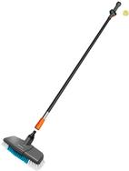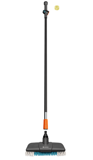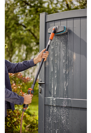 Mit dem GARDENA Cleansystem Wasch-Set mit Stiel soft gelingt die großflächige Nassreinigung von z. B. Gewächshäusern oder Terrassenüberdachungen im Handumdrehen.Schnelle und effektive FlächenreinigungMit der Kombination von Bürste, wasserführendem Stiel und reinigenden Tabs steht einer intensiven Outdoorreinigung nichts mehr im Wege. Empfindlichere Flächen wie Wintergärten, Terrassenüberdachungen oder Gewächshäuser werden mit diesem Putzset wie neu erscheinen. Der Stiel wird mit einem einfachen \"Klick\" an den Gartenschlauch angeschlossen, während die Reinigungsbürste per Schraubverbindung mit dem Stiel verbunden wird. Der Seifenring wird einfach in das Beimischgerät des Stieles eingefügt und schon kann es losgehen.Bequemes Saubermachen mit viel ReichweiteDer GARDENA Stiel S verlängert den Putzradius um ganze 90 cm. Diese Erweiterung erleichtert besonders die Reinigung vertikaler Flächen wie beispielsweise bei Gewächshäusern oder Garagentoren. Für eine angenehme Arbeitsweise besteht der Stiel aus hochwertigem, stabilem Aluminium und ist mit einer Ummantelung versehen. Dadurch bleibt die Oberfläche selbst bei niedrigen Außentemperaturen angenehm warm und komfortabel in der Handhabung.Regulierbare Wassermenge und gründliche SauberkeitNachdem der Gartenschlauch mit nur einem Handgriff angeschlossen wurde, ermöglicht der Griff des Stiels eine stufenlose Regulierung und Abschaltung der Wasserzufuhr. Die Shampooringe werden direkt in das Beimischgerät am Stiel eingelegt. In Kombination mit dem Wasser wird das Shampoo optimal dosiert auf die Oberfläche aufgebracht. Der transparente Beimischtopf gewährleistet zu jeder Zeit einen klaren Überblick darüber, wie weit sich die Ringe bereits aufgelöst haben.Schonende Reinigung ohne BeschädigungenEin herausragendes Merkmal der soften Stielbürste liegt in ihrer Sanftheit. Durch speziell entwickelte, weiche Borsten ermöglicht sie eine schonende und dennoch gründliche Reinigung von empfindlichen Oberflächen. Der Bürstenkopf ist in 30°-Stufen rundum drehbar, wodurch er sich optimal an die zu reinigende Fläche anpassen lässt. Die umlaufende Weichkunststoffleiste verhindert dabei jegliche Kratzspuren.