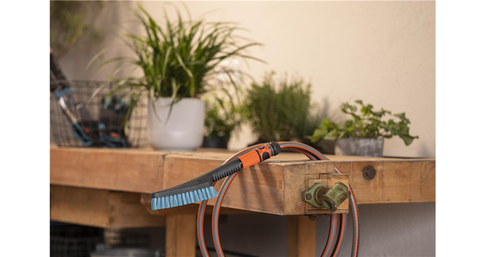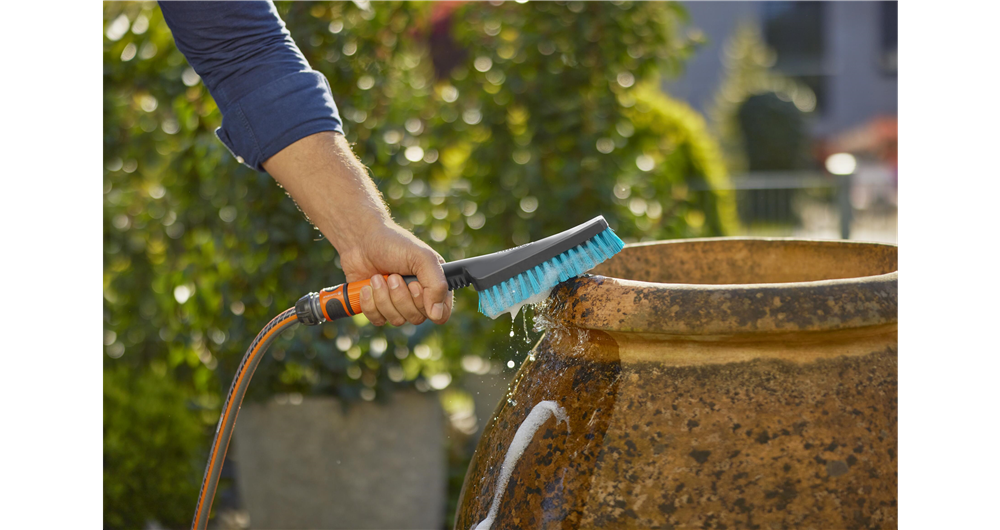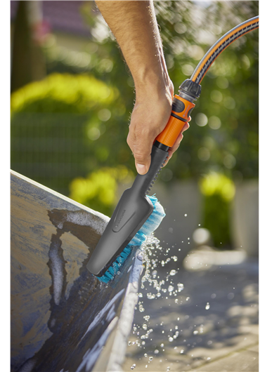Die GARDENA Cleansystem Handbürste S hard für die effektive und gründliche Nassreinigung kleinerer, unempfindlicher Flächen im Außenbereich.Gründliche und effektive Nassreinigung kleinerer robuster AußenflächenEinfach die Waschbürste per „Klick“ an den Wasserschlauch anschließen und schon kann es los gehen. Mit der wasserführenden Handwaschbürste lassen sich problemlos kleinere, unempfindliche Oberflächen, wie Mülleimer nass reinigen, ohne sich dabei ständig nach einem Eimer bücken zu müssen. Der rutschfeste Griff ermöglicht eine sichere und stabile Handhabung - ideal zum Schrubben von hartnäckigem und tiefsitzendem Schmutz.Harte Borsten zur intensiven Reinigung unempfindlicher OberflächenDie harten Borsten der Bürste wurden speziell für alle unempfindlicheren Flächen im Außenbereich entwickelt. Die gründliche Reinigung kleinerer robuster Flächen auf Balkon, Terrasse oder im Garten gelingt damit optimal. Mit der wasserführenden harten Bürste lässt sich grober und hartnäckiger Schmutz im Handumdrehen entfernen. Die kraftvolle Handbürste für flexibles Reinigen mit regulier- und absperrbarem WasserdurchflussMit einer einfachen Drehung am Griff der Bürste kann die Wassermenge nach Bedarf eingestellt oder das Wasser ganz abgestellt werden. Die robuste Handbürste mit stufenloser Durchflussregulierung bietet so die volle Kontrolle über die Wassermenge während der Reinigung und ermöglicht eine gezielte und effiziente Behandlung unempfindlicher Oberflächen. Ein unverzichtbares Werkzeug für alle, die ständige Gänge zum Wasserhahn während der Reinigungsarbeit als störend und zeitaufwendig empfinden.Optimale Schmutzentfernung mit SeifenstäbchenDie GARDENA Seifenstäbchen (Art. 989) sorgen für eine noch gründlichere Reinigung. Einfach den Reinigungsstick in die Bürste stecken, Bürste auf den Schlauch klicken und schon wird das Shampoo optimal dosiert automatisch dem Wasser beigemischt. Das erspart ein umständliches Anmischen von Putzwasser mit speziellen Reinigungsmitteln und das Wasser-/Seifengemisch wird direkt über die Bürste auf die Oberfläche aufgebracht. Die optimale Kombination, um Gartenzäune und ähnliche Flächen strahlend sauber zu halten.