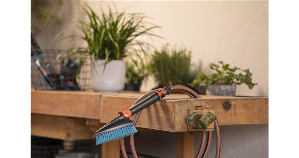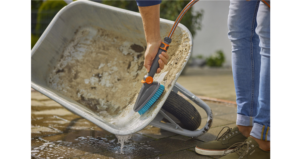 Die GARDENA Cleansystem Handbürste M hard für die effektive und gründliche Nassreinigung kleinerer, unempfindlicher Flächen im Außenbereich.Gründliche und effektive Nassreinigung kleinerer robuster AußenflächenEinfach die Waschbürste per „Klick“ an den Wasserschlauch anschließen und schon kann es los gehen. Mit der wasserführenden Handwaschbürste lassen sich problemlos kleinere, unempfindliche Oberflächen, wie Schubkarren nass reinigen, ohne sich dabei ständig nach einem Eimer bücken zu müssen. Der rutschfeste Griff ermöglicht eine sichere und stabile Handhabung - ideal zum Schrubben von hartnäckigem und tiefsitzendem Schmutz.Harte Borsten zur intensiven Reinigung unempfindlicher OberflächenDie harten Borsten der Bürste wurden speziell für alle unempfindlicheren Flächen im Außenbereich entwickelt. Die gründliche Reinigung kleinerer robuster Flächen auf Balkon, Terrasse oder im Garten gelingt damit optimal. Mit der wasserführenden harten Bürste lässt sich grober und hartnäckiger Schmutz im Handumdrehen entfernen. Einhändig zu bedienen mit regulier- und absperrbarem WasserdurchflussDie Wasserzufuhr kann per Knopfdruck gestartet und abgestellt werden. Über den Hebel am Bürstenkopf kann die Wassermenge stufenlos und mit nur einer Hand reguliert werden. Damit bietet diese kraftvolle Handbürste mit stufenloser Durchflussregulierung die volle Kontrolle über die Wassermenge und ermöglicht so die gezielte und effiziente Reinigung robuster Oberflächen. Ein unverzichtbares Werkzeug für alle, die ständige Gänge zum Wasserhahn während der Reinigungsarbeit als störend und zeitaufwendig empfinden.Optimale Schmutzentfernung mit SeifenstäbchenDie GARDENA Seifenstäbchen (Art. 989) sorgen für eine noch gründlichere Reinigung. Einfach den Reinigungsstick in die Bürste stecken, Bürste auf den Schlauch klicken und schon wird das Shampoo optimal dosiert automatisch dem Wasser beigemischt. Das erspart ein umständliches Anmischen von Putzwasser mit speziellen Reinigungsmitteln und das Wasser-/Seifengemisch wird direkt über die Bürste auf die Oberfläche aufgebracht. Die optimale Kombination, um Schubkarren und ähnliche Flächen sauber zu schrubben.