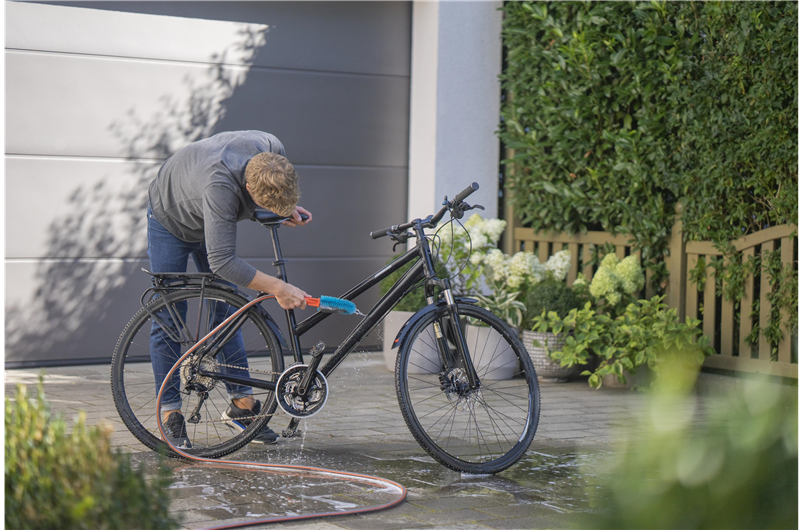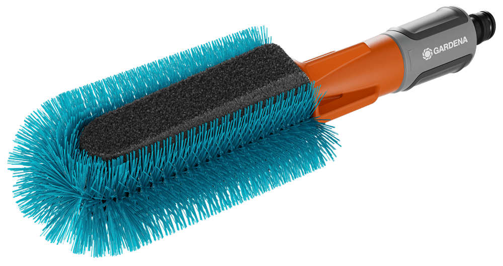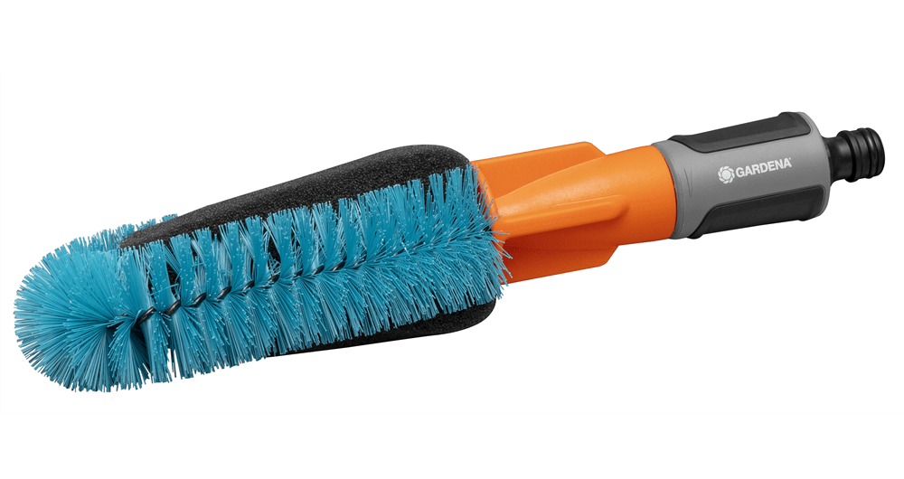 Die GARDENA Fahrradbürste mit Schlauchanschluss erleichtert sämtliche Reinigungsarbeiten rund ums Rad.Fahrräder einfach und schnell reinigen mit der Bürste mit WasseranschlussDie Reinigung der Fahrräder, Anhänger und Co. steht wieder an und es müssen erst einmal verschiedene Utensilien wie Schwämme, Bürsten, Reinigungsmittel und Eimer mit Wasser vorbereitet werden? Diese zeitaufwändige und umständliche Prozedur gehört mit der GARDENA Cleansystem Fahrradbürste ab sofort der Vergangenheit an. Die einzige Vorarbeit besteht in einem simplen \"Klick\", mit dem die Bürste an den Gartenschlauch angeschlossen wird. Die wasserführende Reinigung kann sofort losgehen und E-Bike, Fahrradanhänger und Kinderwagen erstrahlen dank des cleveren Designs der Waschbürste in neuem Glanz.Dank der einfachen Bedienung geht die Fahrradreinigung ganz leicht von der HandDiese clevere Bürste ist für jeden Winkel des Fahrrads optimal ausgelegt. Um besonders hartnäckigen und groben Schmutz am Fahrradrahmen kümmern sich die türkisfarbenen Borsten, während empfindlichere Stellen wie beispielsweise die Speichen von dem sanfteren Schwamm gereinigt werden können. Seine speziell designte Keilform erreicht die Fahrradspeichen ideal und sorgt für eine zuverlässige Reinigung. Bei Bedarf oder nach Abnutzung kann der Schwamm (Art. 18849) ausgetauscht werden.Regulierbare WassermengeAm Wasserschlauch angeschlossen, kann die gewünschte Wasserzufuhr einfach am Griff der Bürste stufenlos reguliert oder ganz abgestellt werden. Dadurch bleibt der lästige Gang zum Wasserhahn während der Anwendung erspart.Eine Reinigungslösung für noch mehr BequemlichkeitEin zusätzliches Anmischen von Putzwasser ist mit dieser Fahrradbürste nicht nötig. Wer bei hohem Verschmutzungsgrad dennoch auf Putzmittel zurückgreifen möchte, kann die hierfür ausgelegten Cleansystem Reinigungssticks (Art. 989) verwenden. Die Seifenstäbchen werden einfach in den Anschlussnippel der Handbürste eingefügt. Das Reinigungsstäbchen wird dann vom Wasser umflossen und gleichmäßig auf der zu reinigenden Fläche verteilt.