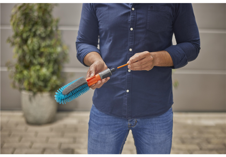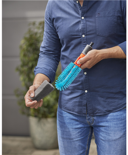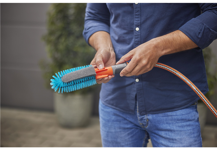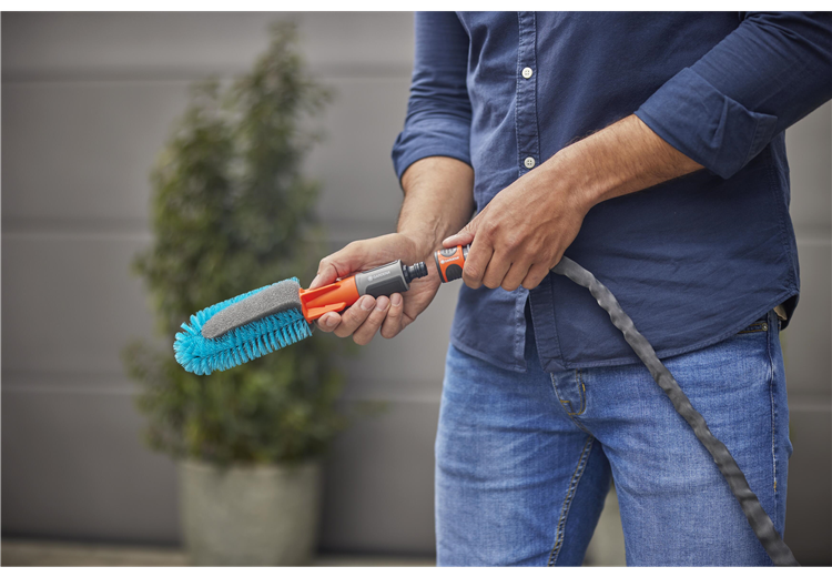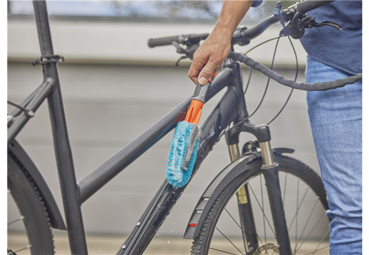 In dem GARDENA Cleansystem Fahrrad Wasch-Set sind alle Utensilien enthalten, die für sämtliche Reinigungsarbeiten rund ums Rad nötig sind.Fahrräder einfach und schnell reinigen mit der Bürste mit WasseranschlussDie Reinigung der Fahrräder, Anhänger und Co. steht wieder an und es müssen erst einmal verschiedene Utensilien wie Schwämme, Bürsten, Reinigungsmittel und Eimer mit Wasser vorbereitet werden? Diese zeitaufwändige und umständliche Prozedur gehört mit der GARDENA Cleansystem Fahrradbürste ab sofort der Vergangenheit an. Die einzige Vorarbeit besteht in einem simplen \"Klick\", mit dem die Bürste an den Gartenschlauch LianoTM Life angeschlossen wird. Die wasserführende Reinigung kann sofort losgehen und E-Bike, Fahrradanhänger und Kinderwagen erstrahlen dank des cleveren Designs der Waschbürste in neuem Glanz.Dank der einfachen Bedienung geht die Fahrradreinigung ganz leicht von der HandDiese clevere Bürste ist für jeden Winkel des Fahrrads optimal ausgelegt. Um besonders hartnäckigen und groben Schmutz am Fahrradrahmen kümmern sich die türkisfarbenen Borsten, während empfindlichere Stellen wie beispielsweise die Speichen von dem sanfteren Schwamm gereinigt werden können. Seine speziell designte Keilform erreicht die Fahrradspeichen ideal und sorgt für eine zuverlässige Reinigung. Bei Bedarf oder nach Abnutzung kann der Schwamm (Art. 18849) ausgetauscht werden.Regulierbare WassermengeAm im Set enthaltenen Liano™ Life Textilschlauch angeschlossen, kann die gewünschte Wasserzufuhr einfach am Griff der Bürste stufenlos reguliert oder ganz abgestellt werden. Dadurch bleibt der lästige Gang zum Wasserhahn während der Anwendung erspart. Zusätzlich erübrigt sich ein Hin- und Herlaufen durch den praktischen Wasserstop am Ende des Schlauches beim Wechsel von Fahrradbürste auf Reinigungsspritze.Eine Reinigungslösung im kompletten SetDas Set ist mit allem, was es für die effektive Fahrradreinigung braucht, ausgestattet. Neben der GARDENA Fahrradbürste enthält das Set den 15 m langen GARDENA Liano™ Life 1/2\" Schlauch inklusive Hahnverbindern, Schlauchanschlüssen und Reinigungsspritze. Zusätzlich sorgen die GARDENA Reinigungssticks für blitzblanke Ergebnisse. Die Seifenstäbchen sind sowohl für robuste als auch empfindliche Oberflächen geeignet und werden einfach in den Anschlussnippel der Handbürste eingefügt. Das Reinigungsstäbchen wird dann vom Wasser umflossen und gleichmäßig auf der zu reinigenden Fläche verteilt.