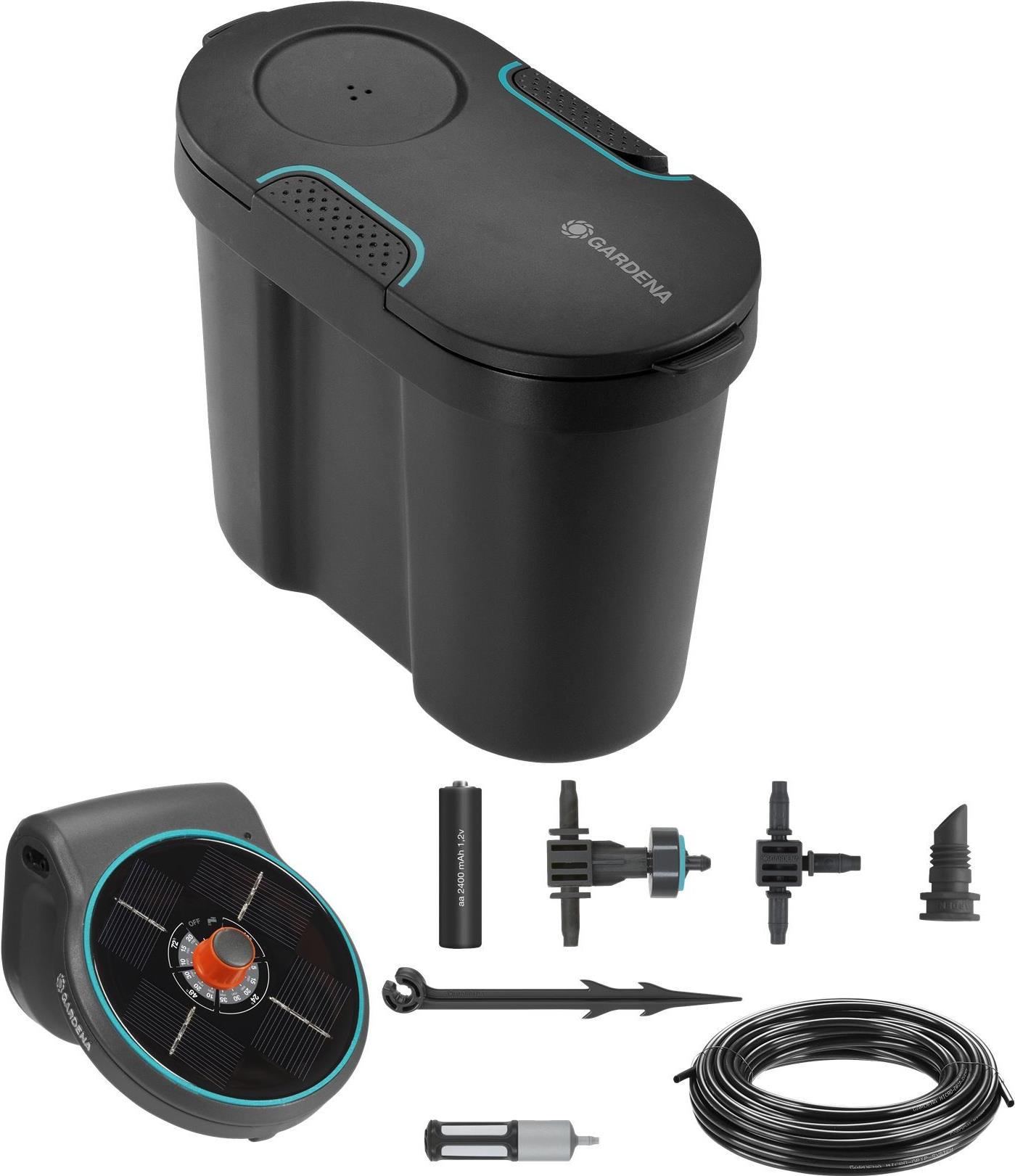 Filter, erweiterbares Wasserreservoir (10,5 L) mit Verschlussstopfen, Steuereinheit mit integrierter Pumpe und Solarpanel, 20 druckausgleichende Reihentropfer (0,5 L/h), 3 wiederaufladbare AA Batterien (1,2 V / 2,400 mAh), 15 Rohrhalter 4,8 mm (3/16"), 8 T-Stückverbinder 4,8 mm (3/16"), 8 Verschlussstopfen 4,8 mm (3/16"), Schlauch (4,8 mm x 20 m)