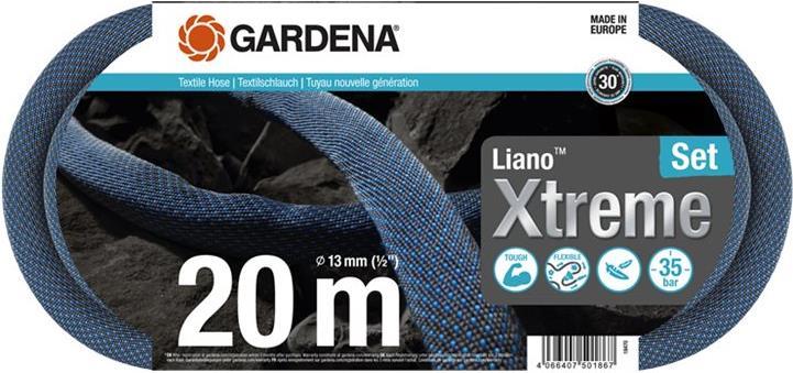 Verwenden Sie das Textilschlauch-Set Liano Xtreme 20 m von GARDENA für lange und anspruchsvolle Bewässerungen. Mit einer Gesamtlänge von 20 m ist der Textilschlauch mit einem Durchmesser von 13 mm (1/2\") ideal für mittelgroße Gärten. Die Original GARDENA Systemteile Liano Schlauchverbinder und Liano Wasserstop sind bereits am Liano Xtreme vormontiert. Zusätzlich sind zwei Zapfhahnanschlüsse und eine Reinigungsdüse im Set enthalten. Da in einem der beiden Zapfhahnanschlüsse ein Reduzierstück integriert ist, haben Sie die Möglichkeit, den Textilschlauch an drei verschiedene Zapfhahngrößen anzuschließen. Seine herausragende Leistung, Flexibilität und hohe Widerstandsfähigkeit gegenüber äußeren Einflüssen erhält der Liano Xtreme durch den sehr flexiblen PVC-Innenschlauch und den innovativen Außenschlauch aus extrem widerstandsfähigem Textilgewebe. Das macht ihn langlebig und bereit für anspruchsvolle Herausforderungen in Ihrem Garten. Er meistert unwegsames Gelände, Kopfsteinpflaster, Rosendornen oder das Schleifen an der Hauswand, ohne zu knicken oder an Hindernissen hängen zu bleiben. Durch die angenehme, rutschfeste Haptik und das geringe Gewicht können Sie den Liano Xtreme auch über einen längeren Zeitraum bequem nutzen. Der schmutzabweisende Textilschlauch ist bis zu 50% leichter als herkömmliche PVC-Schläuche. Nach der Bewässerung können Sie den Liano Xtreme dank seiner guten Flexibilität platzsparend lagern, zum Beispiel in einem Regal oder in einem Schuppen. Er passt sich dem vorhandenen Stauraum an. Der Schlauch hat einen Berstdruck von 35 bar. Durch seine UV- und Frostbeständigkeit kann er das ganze Jahr über im Garten verbleiben. Der schadstofffreie Textilschlauch ist frei von Phthalaten (< 0,1%) sowie Cadmium, Blei und Barium (< 0,1%).Produkttext[/head]Nutze das Textilschlauch Liano™ Xtreme 20 m Set von GARDENA für eine lange und anspruchsvolle Bewässerung. Dank einer Gesamtlänge von 20 m ist der Textilschlauch mit einem Durchmesser von 13 mm (1/2\") für mittelgroße Gärten ideal geeignet. Die Original GARDENA Systemteile Liano™ Schlauchverbinder sowie Liano™ Wasserstop sind am Liano™ Xtreme bereits vormontiert. Zusätzlich sind im Set zwei Hahnverbinder und eine Reinigungsspritze enthalten. Da in einem der beiden Hahnverbinder ein Reduzierstück integriert ist, hast Du die Möglichkeit, den Textilschlauch an drei verschiedenen Hahngrößen anzuschließen. Seine herausragende Performance, Flexibilität und hohe Resistenz gegenüber äußeren Einflüssen erhält der Liano™ Xtreme durch den sehr flexiblen PVC-Innenschlauch und den innovativen Außenschlauch aus extrem widerstandsfähigem Textilgewebe. Dadurch ist er langlebig und bereit für anspruchsvolle Herausforderungen in Deinem Garten. Er meistert unwegsames Gelände, Pflastersteine, Rosendornen oder das Ziehen entlang der Hauswand, ohne zu verknicken oder an Hindernissen hängen zu bleiben. Auch über einen längeren Zeitraum kannst Du den Liano™ Xtreme komfortabel benutzen. Dafür sorgen die angenehme, griffige Haptik und das geringe Gewicht. So ist der schmutzabweisende Textilschlauch bis zu 50 % leichter als herkömmliche PVC-Schläuche. Nach der Bewässerung bewahrst Du den Liano™ Xtreme dank seiner guten Flexibilität platzsparend zum Beispiel im Regal, Schuppen oder Auto auf. Er passt sich dem vorhandenen Stauraum an. Der Schlauch verfügt über einen Berstdruck von 35 bar. Aufgrund der UV- und Frostbeständigkeit kann er ganzjährig im Garten bleiben. Der schadstofffreie Textilschlauch ist frei von Phthalaten (Ideal für die Bewässerung von mittelgroßen GärtenDer Textilschlauch Liano™ Xtreme ist 20 m lang und verfügt über einen Schlauchdurchmesser von 13 mm (1/2\"). Er ist ideal für die lange und anspruchsvolle Bewässerung mittelgroßer Gärten geeignet.KomplettsetDas sofort einsatzbereite Set beinhaltet neben dem Liano™ Life die vormontierten Original GARDENA Systemteile Liano™ Wasserstop und Liano™ Schlauchverbinder, eine Reinigungsspritze sowie zwei Hahnverbinder. Einer der Hahnverbinder ist mit einem Reduzierstück ausgestattet, sodass der Schlauch an insgesamt drei Hahngrößen angeschlossen werden kann.Für das Extreme gemachtDer extrem belastbare Schlauch ist schmutzabweisend und widersteht auch groben Oberflächen wie Rosendornen, Pflastersteinen und entlang der Hauswand mühelos.FlexibelDie hohe Flexibilität des Schlauches sorgt dafür, dass er einfach zu manövrieren ist und dabei nicht verknickt. Er verfügt über angenehme Haptik für eine bessere Handhabung.Ein echtes LeichtgewichtMit seinem geringen Gewicht ist der Gartenschlauch bis zu 50 % leichter als herkömmliche PVC-Schläuche und daher auch über längere Zeiträume hinweg bequem zu tragen.Einfach und kompakt zu verstauenDie Flexibilität des Liano™ Xtreme ermöglicht eine platzsparende Aufbewahrung, da er sich ideal an den vorhandenen Stauraum anpasst.Praktische SchlaucheigenschaftenDer Liano™ Xtreme verfügt über einen Berstdruck von 35 bar und kann dank Frost- und UV-Schutz bei Wind und Wetter das ganze Jahr im Garten bleiben. Er ist schadstofffrei und damit frei von Phthalaten (Verlässliche ProduktqualitätGARDENA Produkte aus europäischer Produktion stehen für Qualität, zuverlässige Leistung und Langlebigkeit.[head]Hauptmerkmale