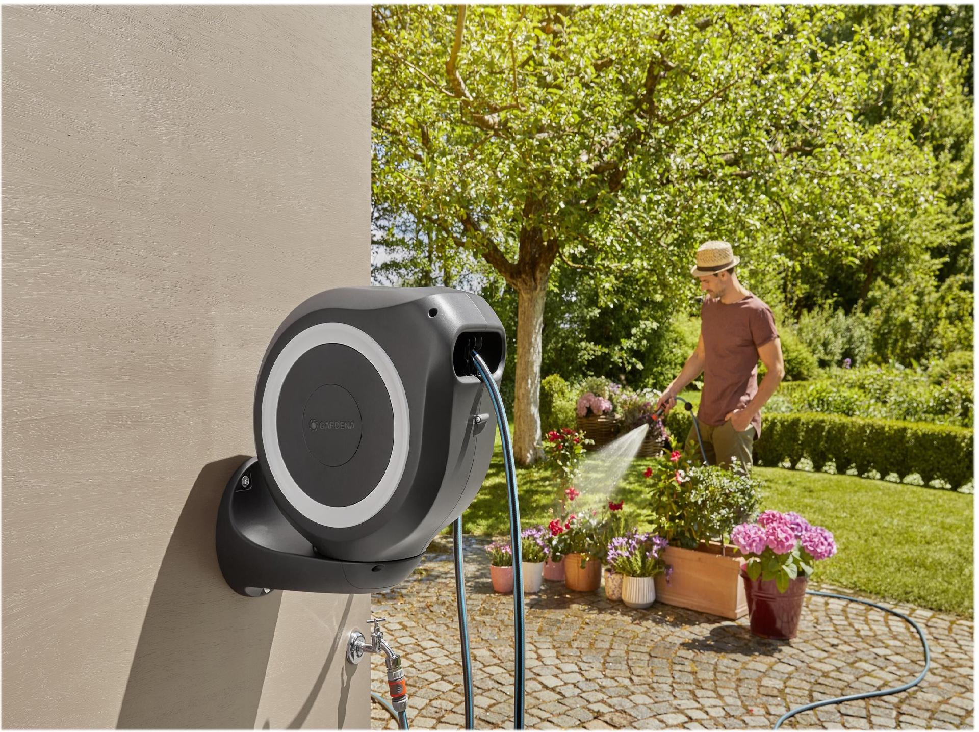 Die Garten-Schlauchbox RollUp M von GARDENA sorgt nicht nur für eine sichere und platzsparende Lagerung Deines Gartenschlauchs, sondern auch für einen bequemen und äußerst handlichen Umgang bei der Bewässerung Deines mittelgroßen Gartens. Die praktische Garten-Schlauchbox wird auf einem robusten Standfuß an einer Stelle Deiner Wahl in der Erde oder im Rasen verankert. Mit Hilfe einer Montagestange kannst Du den Erdspieß noch einfacher in den Boden drehen. Für den Gebrauch ziehst Du den langen Wasserschlauch einfach auf die gewünschte Länge aus und kannst sofort mit der Bewässerung loslegen. Dank der eingebauten kurzen Arretierstops ist der Umgang mit dem Gartenschlauch so bequem wie nie: Sobald Du mit dem Schlauch stehen bleibst, rastet die Arretierung automatisch an der gewünschten Ausziehlänge ein. Die innovative Konstruktion ist um 360° schwenkbar und sorgt damit für höchste Flexibilität bei der Gartenbewässerung. Die Trommel folgt immer Deinen Bewegungen, sodass Du jeden Winkel Deines Gartens mühelos erreichen kannst und der Gartenschlauch dabei nicht abknickt oder verknotet. Zudem ersparst Du Dir mit dieser Schlauchbox lästiges Kurbeln, Aufrollen sowie schmutzige Hände: Durch einen kurzen Zug am Schlauchende löst Du die Arretierung und eine integrierte Stahlfeder rollt den Gartenschlauch vollautomatisch und zuverlässig wieder ein. Damit dabei keine Knoten oder Knicke entstehen, hat die Box eine praktische Schlauchführung, die den Schlauch auf Spur hält. Eine innovative RollControl-Technologie sorgt für den sicheren und kontrollierten Rückzug. Das hochwertige Material wird sowohl von einem UV- als auch einem Frostschutz gesichert und bietet eine lange Lebensdauer und Einsatzfähigkeit ohne Wartungen. Die Box ist besonders kompakt und stilvoll designt, sodass sie sich problemlos in jeden Garten integrieren lässt. Zudem ist sie auf die Höhe der GARDENA Mähroboter abgestimmt, damit auch der Rasen um die Schlauchbox immer gepflegt und gemäht wird. Neben der Garten-Schlauchbox sind außerdem ein flexibler Verbindungsschlauch, alle notwendigen Montageteile und Original GARDENA Systemelemente sowie eine Spritze mit zwei verschiedenen Sprühbildern enthalten.