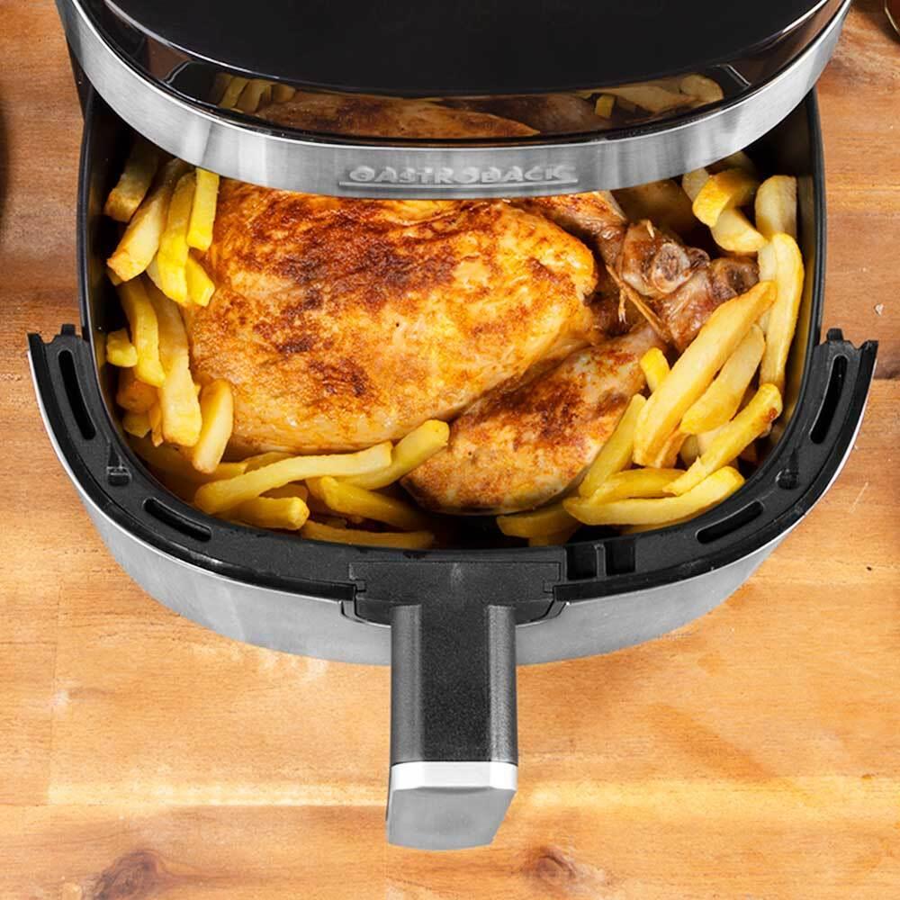 Gastroback Heissluftfritteuse Air Pro ed/sw 1300W 3.7L fettarm 42582 - 8 voreingestellte Programme für Pommes frites - Hähnchenflügel/-schenkel,<br />Fisch - Beefsteak und Kotelett - Kuchen und Trockenfrüchte - einstellbare<br />Temperatur von 80°C bis 200°C in 5°C Schritten (40 - 80°C beim<br />Trockenfrüchte-Programm) - einstellbare Zeit von 1 Min. bis 60 Min. (2 -<br />9 Stunden beim Trockenfrüchte-Programm) (42582)