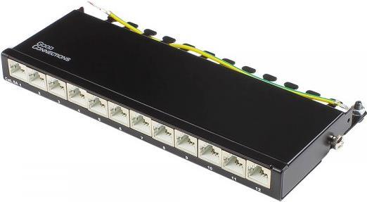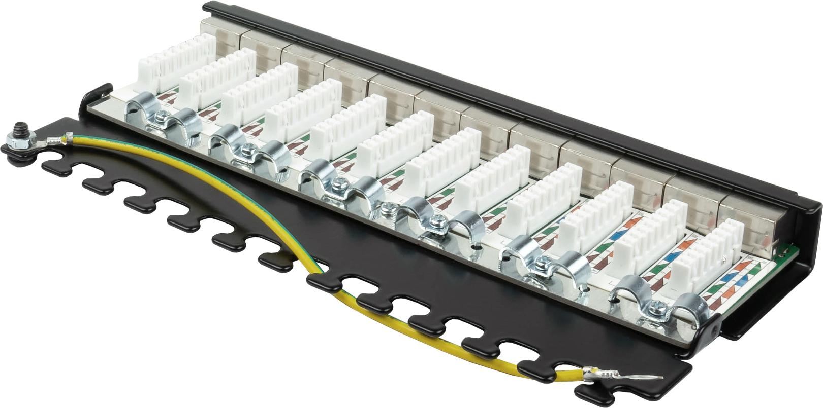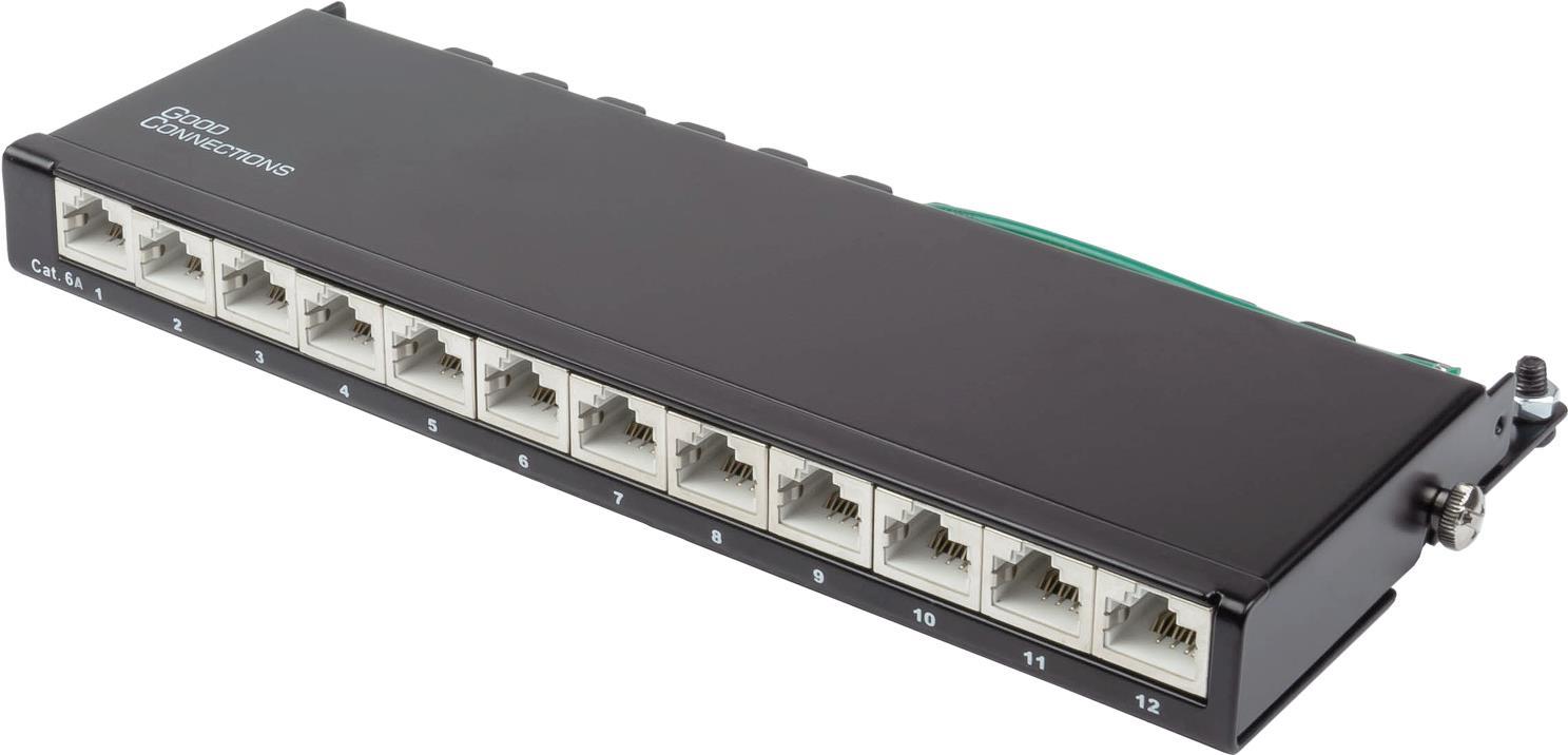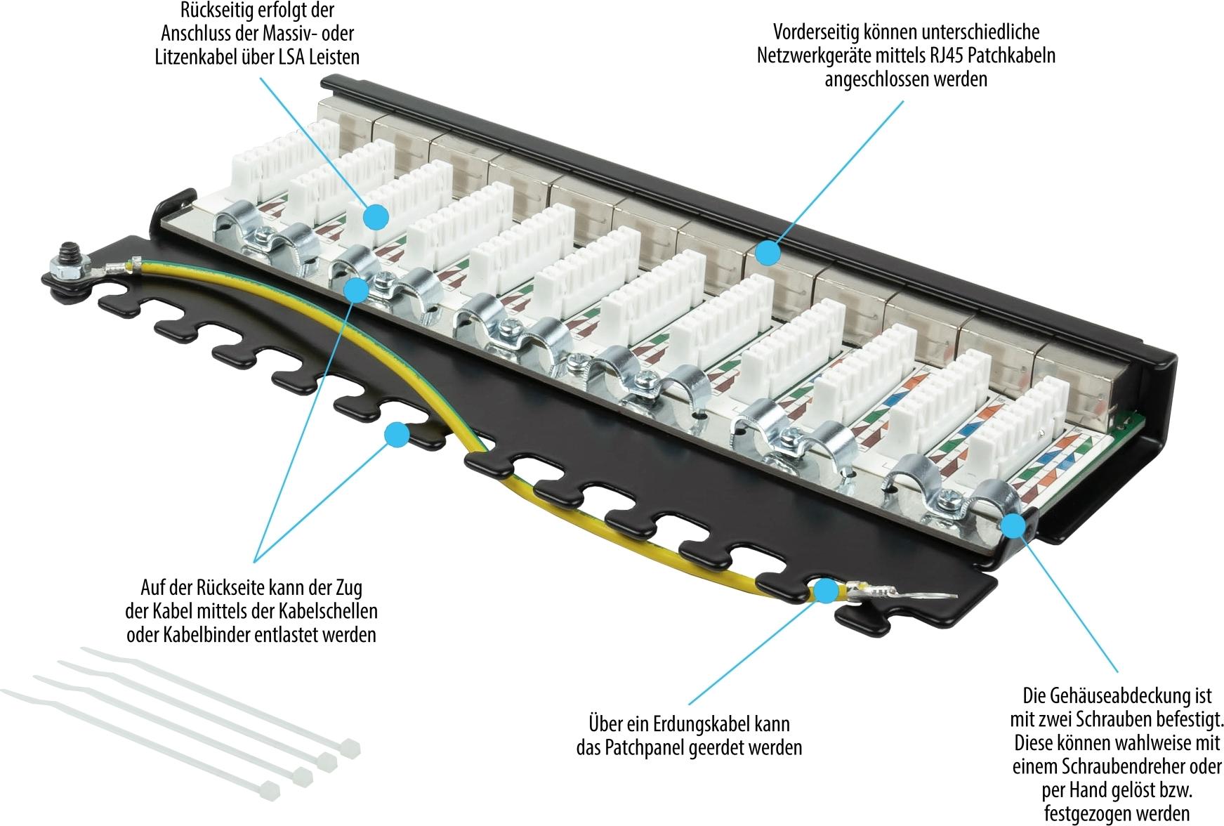 Das vollgeschirmte Cat. 6A Patchpanel von Good Connections® ist aus stabilem 1,5 mm Stahlblech gefertigt und für Ethernet-Netzwerke bis 10 Gigabit/s geeignet. Vorderseitig können unterschiedliche Netzwerkgeräte mittels RJ45 Patchkabeln angeschlossen werden. Rückseitig erfolgt der Anschluss der Massiv- oder Litzenkabel über LSA Leisten. Werkzeugloses Öffnen und Schließen Die Gehäuseabdeckung ist mit zwei Schrauben befestigt. Diese können wahlweise mit einem Schraubendreher oder per Hand gelöst bzw. festgezogen werden.