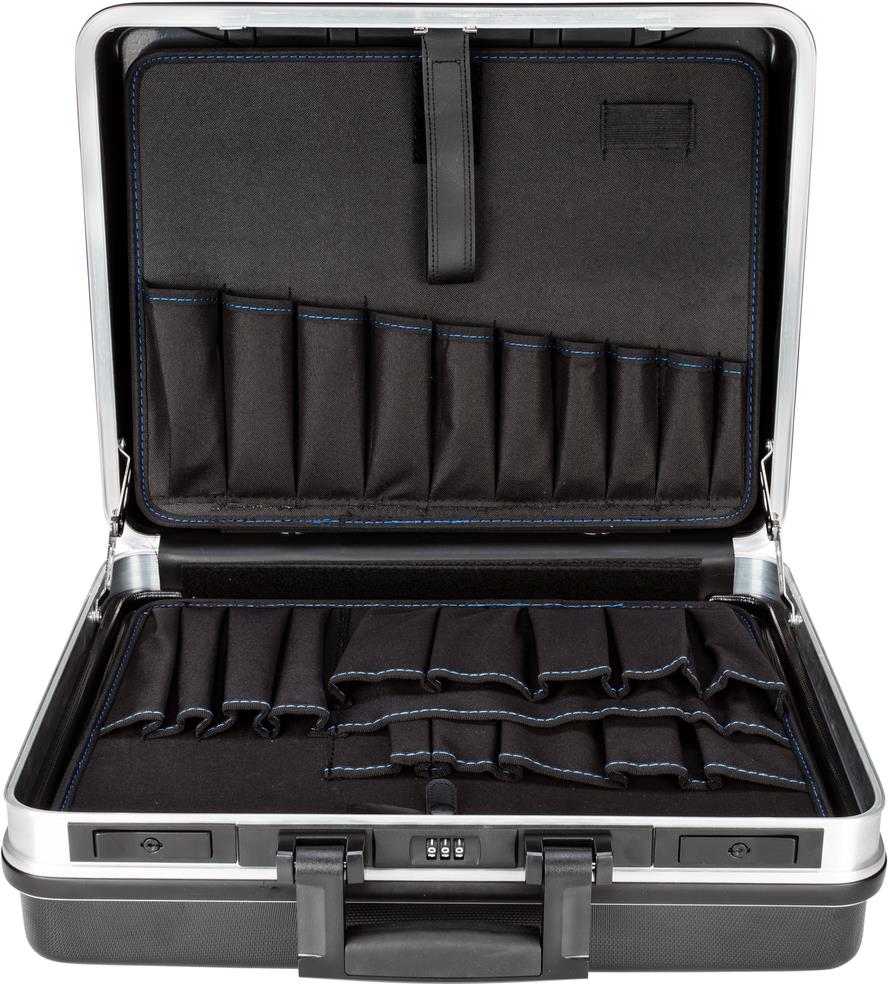 Robuster Rahmen aus Aluminium mit Stoßkantenschutz, Schalen aus schlagfesten ABS-KunststoffDer geöffnete Kofferdeckel ist durch Einrasten des Sicherheitsdeckelhalters vor ungewolltem Schließen geschütztDokumentenfach A4 im DeckelVariabel einteilbare BodenschaleVerschließbar durch 2 Kippzylinderschlösser sowie ein ZahlenschlossHerausnehmbare Werkzeugtafel mit 22 Werkzeugtaschen auf Vorder- und Rückseite im DeckelHerausnehmbare Abdeckplatte für Bodenschale mit 15 WerkzeugtaschenHandsympathischer Tragegriff