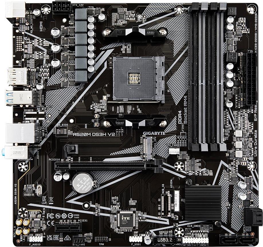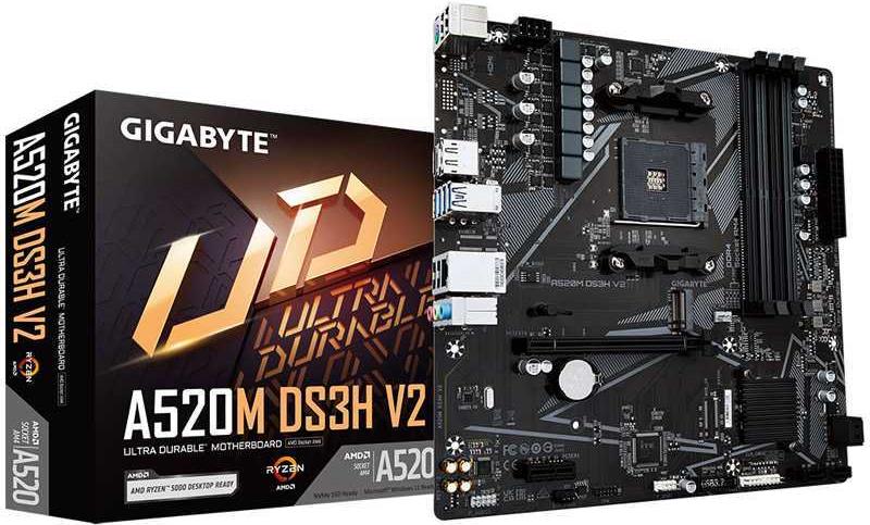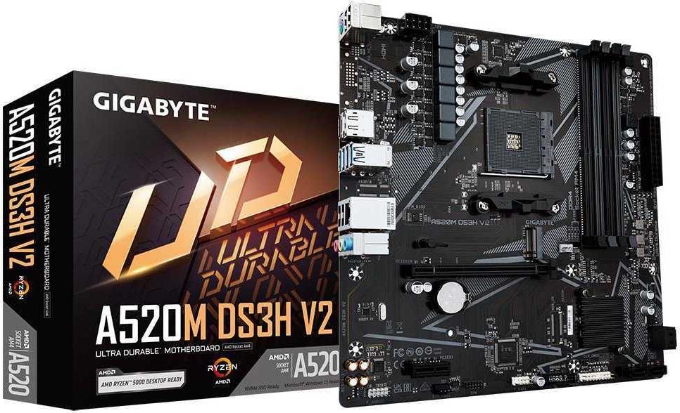 • Gigabyte A520M DS3H V2 (rev. 1.0). Prozessorhersteller: AMD, Prozessorsockel: Socket AM4, Kompatible Prozessoren: 3rd Generation AMD Ryzen™ 3, 3rd Generation AMD Ryzen 5, 3rd Generation AMD Ryzen™ 7, 3rd.... Unterstützte Arbeitsspeicher: DDR4-SDRAM, RAM-Speicher maximal: 128 GB, Arbeitsspeicher Typ: DIMM. Unterstützte Speicherlaufwerk-Schnittstellen: M.2, SATA III, Unterstützte Speicherlaufwerke: HDD & SSD, RAID Level: 0, 1, 10. Maximale Auflösung: 5120 x 2880 Pixel. USB-Stecker: USB Typ-A (A520M DS3H V2)