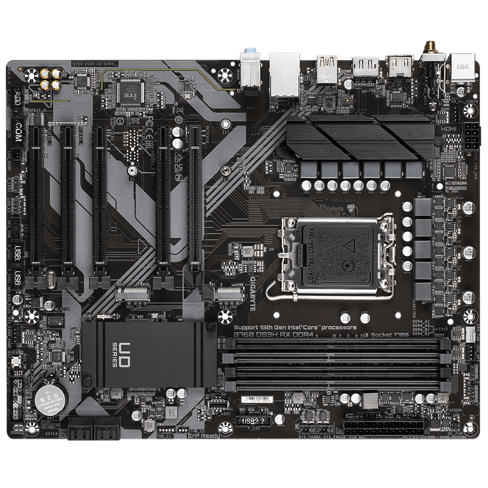 | Produktbeschreibung | Gigabyte B760 DS3H AX DDR4 - 1.X - Motherboard - ATX - LGA1700-Sockel - B760 |