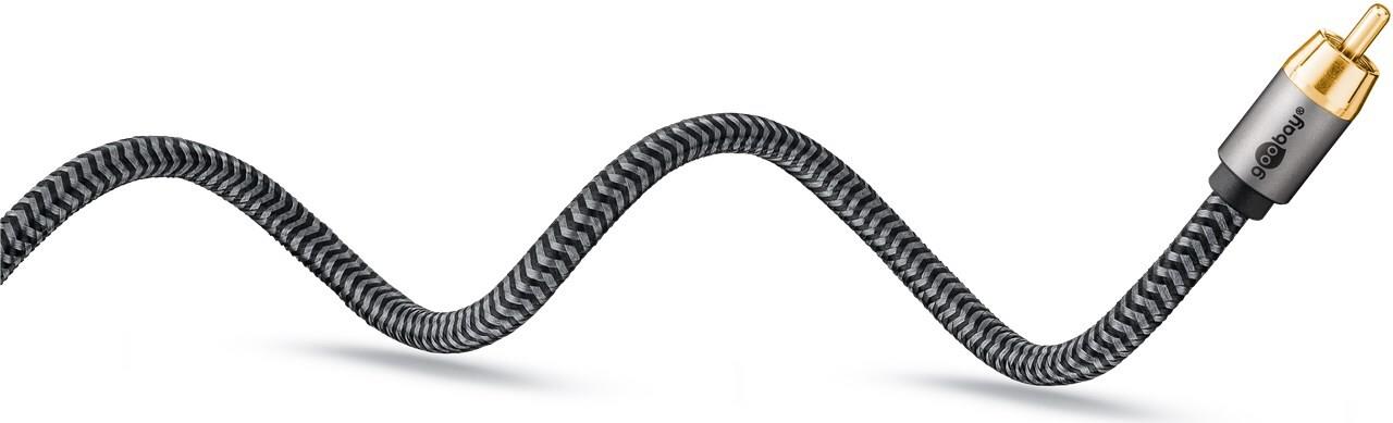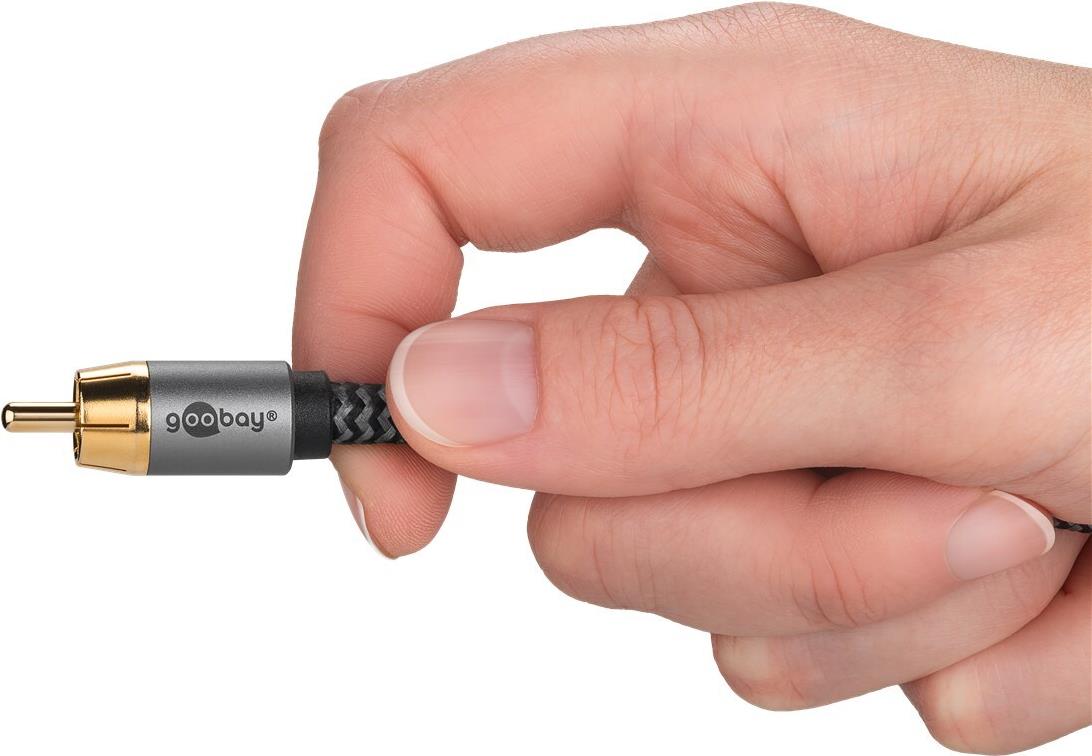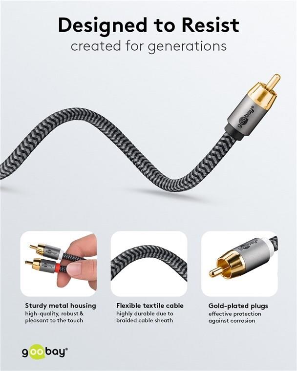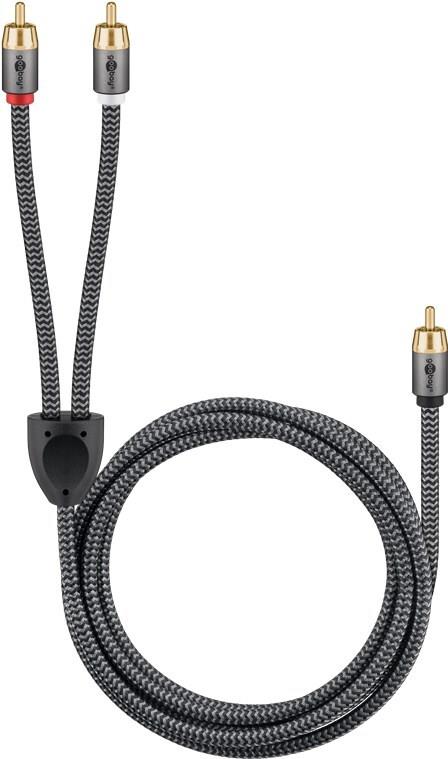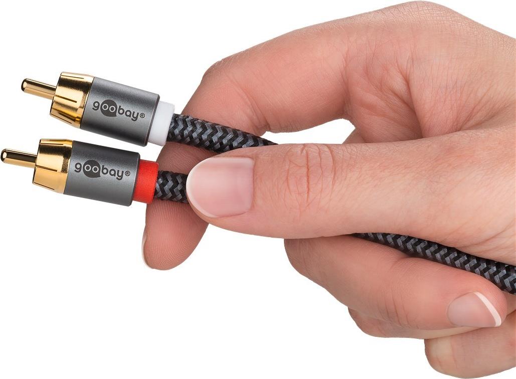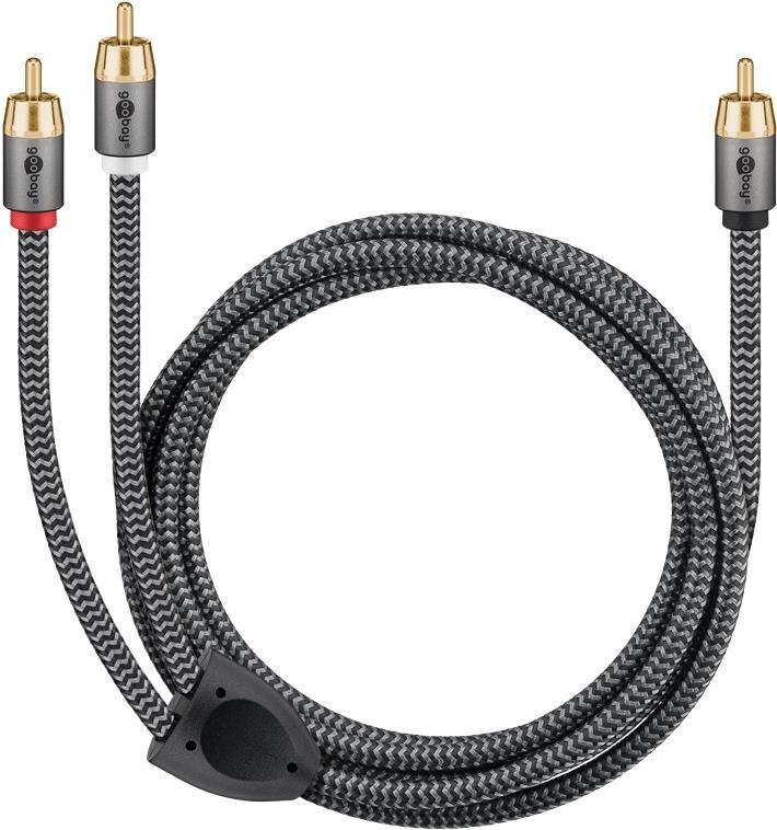 Goobay 65300. Anschluss 1: 2 x RCA, Steckverbinder 1 Geschlecht: Männlich, Anschluss 2: RCA, Steckverbinder 2 Geschlecht: Männlich, Kabelmaterial: Kupfer, Beschichtung Steckerkontakte: Gold, Magnetisch abgeschirmt, AWG Kabelgröße: 23, Kabellänge: 2 m, Produktfarbe: Schwarz, Silber (65300)