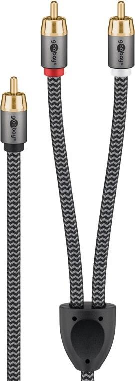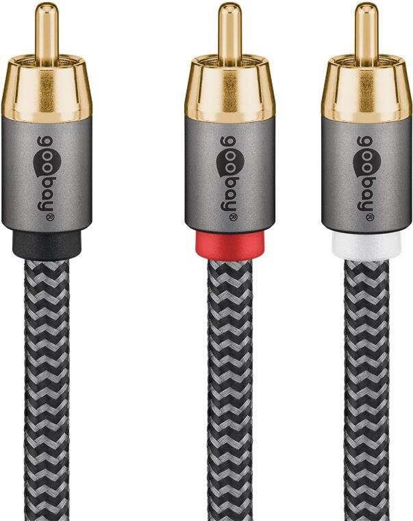 Goobay 65302. Anschluss 1: 2 x RCA, Steckverbinder 1 Geschlecht: Männlich, Anschluss 2: RCA, Steckverbinder 2 Geschlecht: Männlich, Kabelmaterial: Kupfer, Beschichtung Steckerkontakte: Gold, Magnetisch abgeschirmt, AWG Kabelgröße: 23, Kabellänge: 5 m, Produktfarbe: Schwarz, Silber (65302)