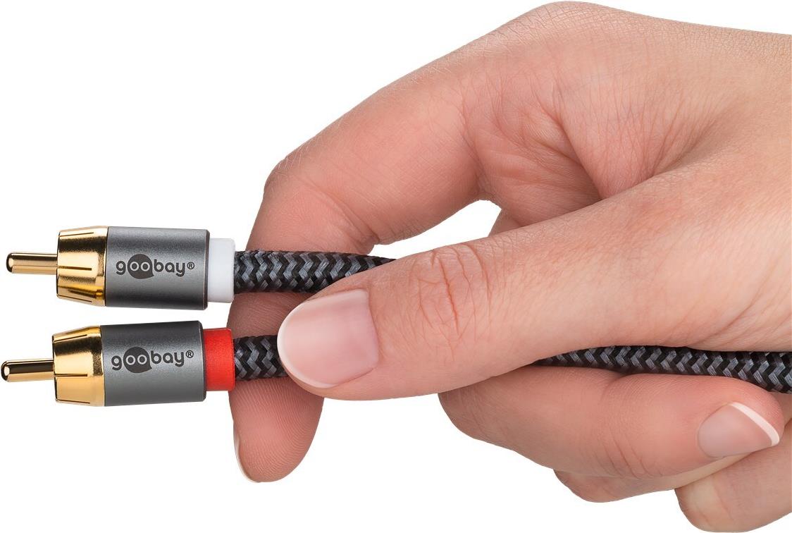 Goobay 65303. Anschluss 1: 2 x RCA, Steckverbinder 1 Geschlecht: Männlich, Anschluss 2: RCA, Steckverbinder 2 Geschlecht: Männlich, Kabelmaterial: Kupfer, Beschichtung Steckerkontakte: Gold, Magnetisch abgeschirmt, AWG Kabelgröße: 23, Kabellänge: 10 m, Produktfarbe: Schwarz, Silber (65303)