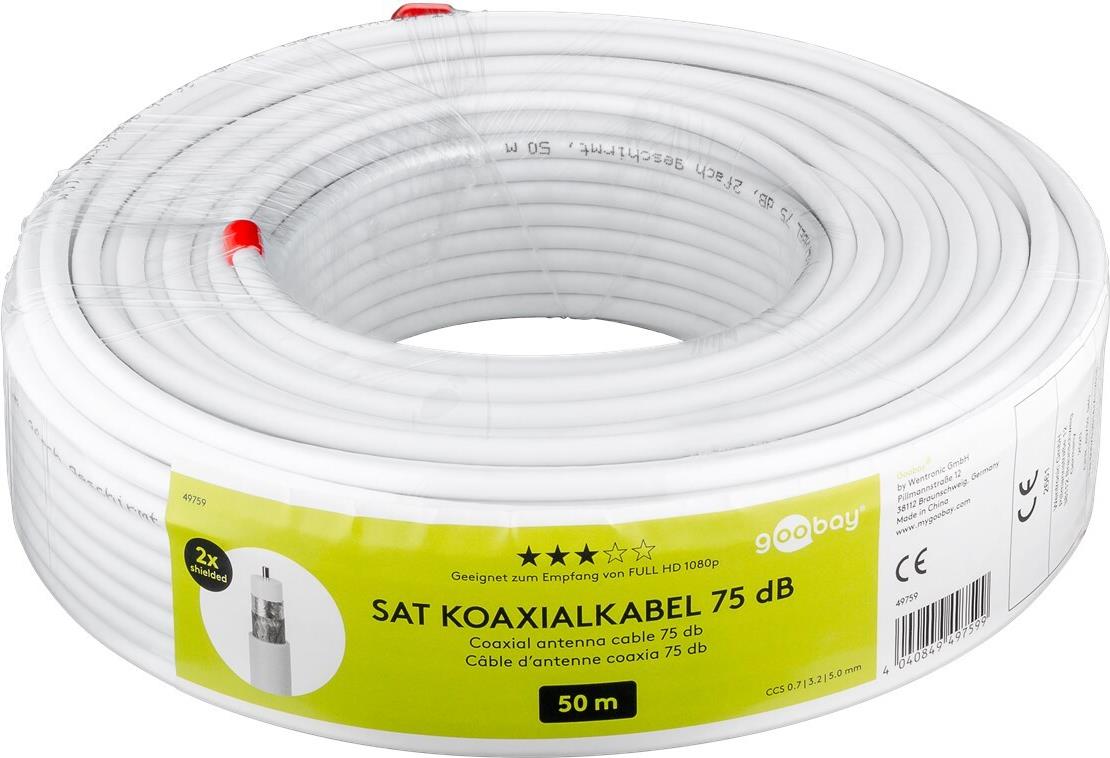 Goobay 75 dB SAT Koaxialkabel, 2x geschirmt, 50 m, Weiß - für digitale SAT- und BK-Kabelanlagen mit Stahl/Kupfer Innenleiter (49759)