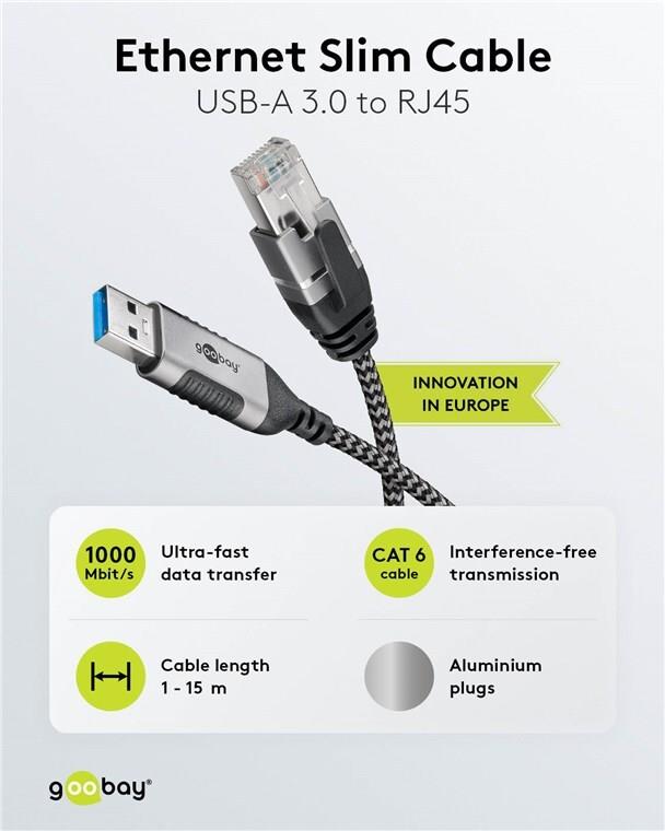 • Goobay Ethernet-Kabel USB-A 3.0 auf RJ45 Slim 10 m - verbindet Router Modem oder (74399)