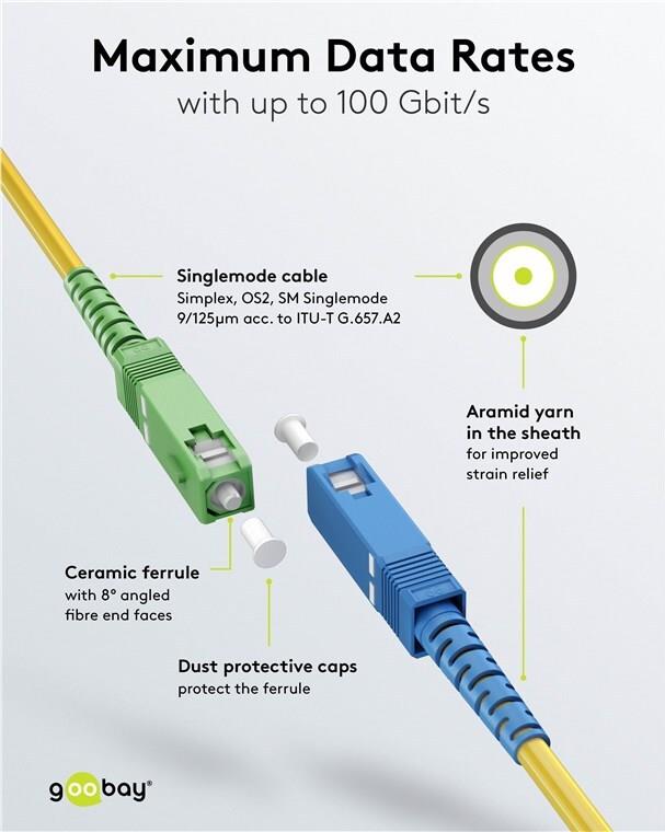 Das goobay Netzwerkkabel von Wentronic ist sowohl auf Sicherheit als auch auf Leistung ausgelegt und verfügt über einen Low Smoke Zero Halogen (LSZH) Mantel, der gefährliche Emissionen im Falle eines Brandes reduziert und eine sicherere Umgebung gewährleistet. Der Kern- und Manteldurchmesser von 9/125 Mikron sowie der Simplex-Kabelmodus sind für die Singlemode-Glasfasertechnologie optimiert und unterstützen Datenübertragungsgeschwindigkeiten von bis zu 100 Gbit/s. Damit ist es perfekt für FTTH-Anwendungen geeignet, bei denen Hochgeschwindigkeits-Internet erforderlich ist.Darüber hinaus umfasst die Konstruktion des Kabels Aramidgarn und eine Keramikferrule, die für Langlebigkeit und Widerstandsfähigkeit gegen Biegen und Knicken sorgen. Eine Zugentlastung und eine Staubschutzkappe sorgen für Langlebigkeit und Zuverlässigkeit der Verbindung. Das Netzwerkkabel von goobay erfüllt mehrere internationale Normen, darunter G.657.A2/OS2 für Glasfasern und IEC-Vorschriften für Sicherheit und Umweltverträglichkeit, und ist damit die ideale Wahl für den Aufbau einer robusten, effizienten und sicheren Netzwerkinfrastruktur.Produkttext[/head]Das Patchkabel eignet sich für private und industrielle Anwendungen, inkl. Glasfaser bis in die Wohnung (Fibre to the Home, FTTH), und ist kompatibel mit dem FTTH-Angebot von Telekom Deutschland, Vodafone, Deutsche Glasfaser etc. Die biegeoptimierte LWL-Faser ermöglicht eine platzsparende Verlegung, ohne dabei die Dämpfung zu erhöhen und so Störungen zu riskieren.[head]Hauptmerkmale