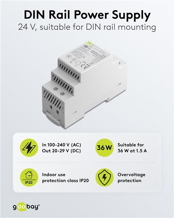 • Goobay Hutschienen-Netzteil DIN-Rail 24 V DC 1.5 A 36 W - geeignet für DIN-Montage (74765)