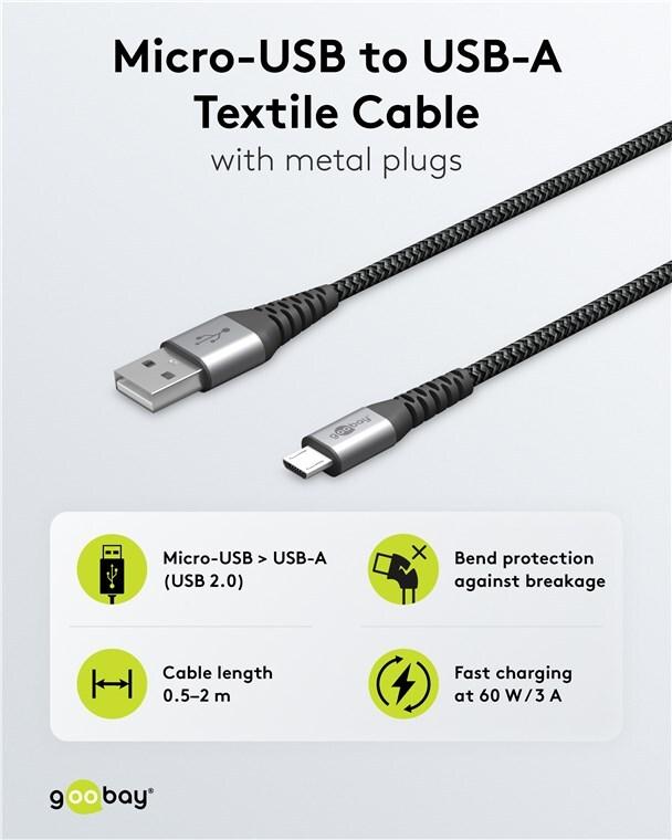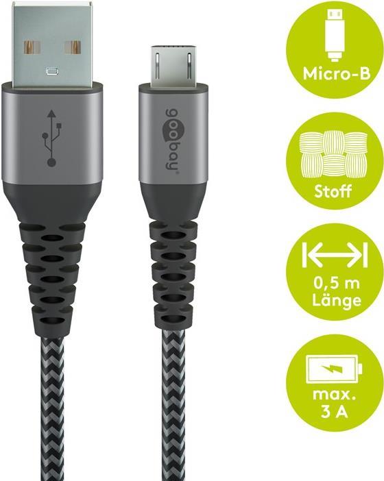 Goobay Micro-USB auf USB-A Textilkabel mit Metallsteckern (space grau/silber) 0,5 m, 0.5 m, Schwarz-Grau - elegantes und extra-robustes Verbindungskabel für Geräte mit Micro-US (49273)