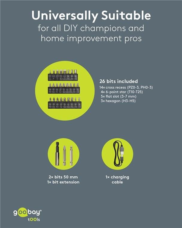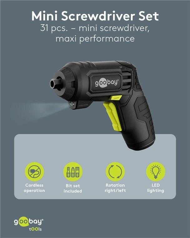Goobay Mini-Akkuschrauber-Set 31-tlg. - in Pistolenform mit Werkzeug-Set aus 28 Bits und 1 (77818)