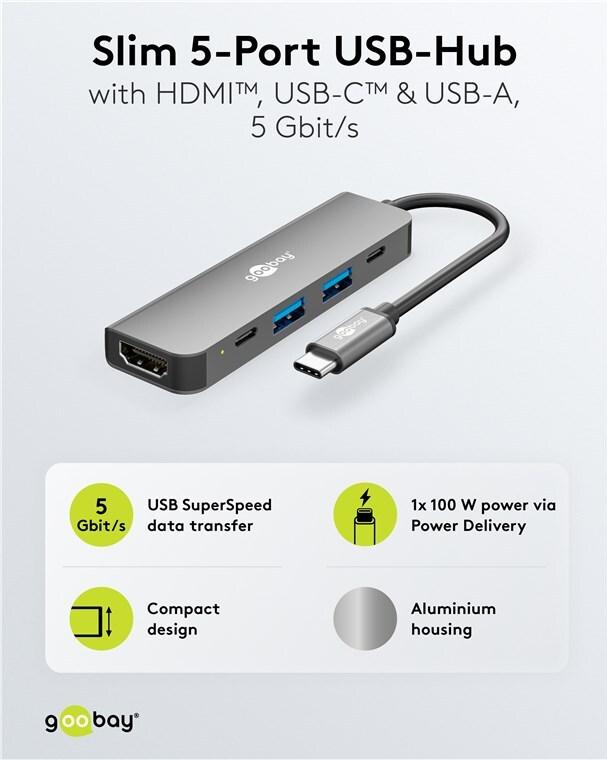 • Goobay Slim 5-Port USB-Hub mit HDMI 5 Gbit/s - USB-C -Stecker USB 3.2> 1x 2x (78967)