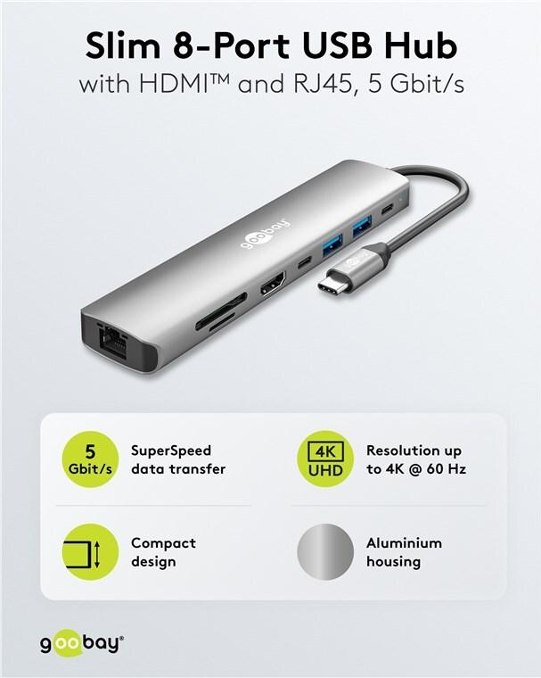 • Goobay Slim 8-Port USB-Hub mit HDMI und RJ45, 5 Gbit/s (79146)