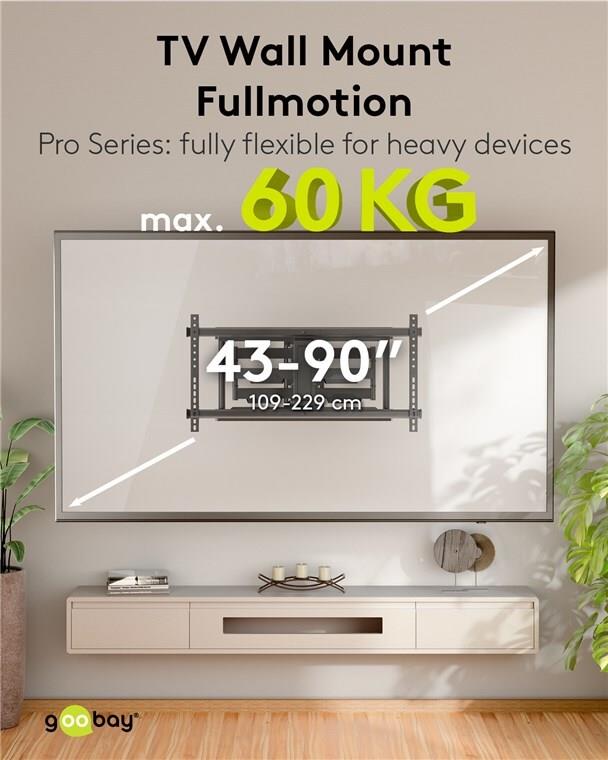 Das extra große Goobay-Montageset von Wentronic wurde entwickelt, um das Seherlebnis für Flachbildschirme von 43 bis 90 Zoll zu verbessern. Diese Halterung aus strapazierfähigem Stahl mit pulverbeschichteter Oberfläche vereint Robustheit mit Stil. Sie bietet eine voll bewegliche Wandhalterung, die zahlreiche Einstellmöglichkeiten ermöglicht, darunter eine Neigung von -10° bis 5°, eine Schwenkbarkeit von bis zu 60° in beide Richtungen und eine Drehbarkeit von -3° bis 3°. Diese Flexibilität ermöglicht optimale Blickwinkel aus verschiedenen Positionen im Raum.