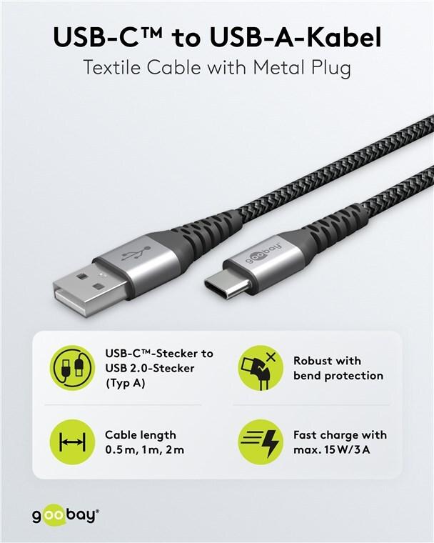 Goobay USB-C™ auf USB-A Textilkabel mit Metallsteckern (space grau/silber) 0,5 m, 0.5 m, Schwarz-Grau - elegantes und extra-robustes Verbindungskabel für Geräte mit USB-C™ Ansc (49295)