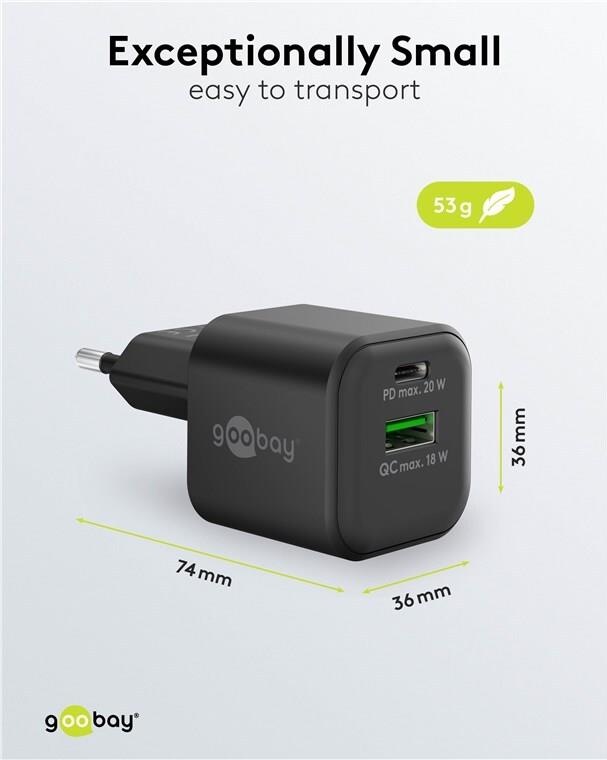 • Goobay USB-C PD GaN Dual-Schnellladegerät Nano 20 W schwarz - 1x -Anschluss Power (65864)