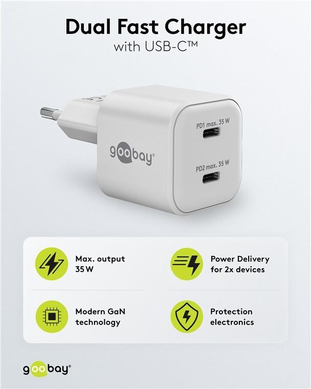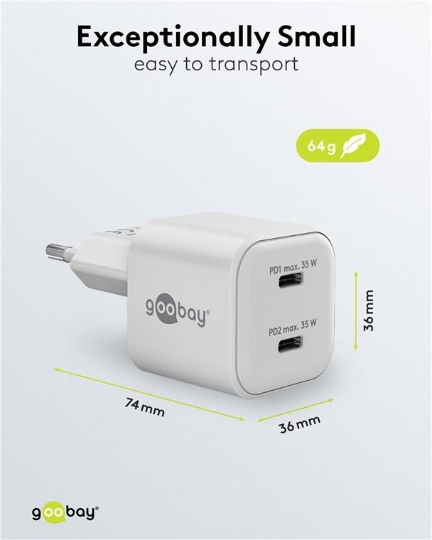 • Goobay USB-C PD GaN Dual-Schnellladegerät Nano 35 W weiß - 2x -Anschluss Power (75334)