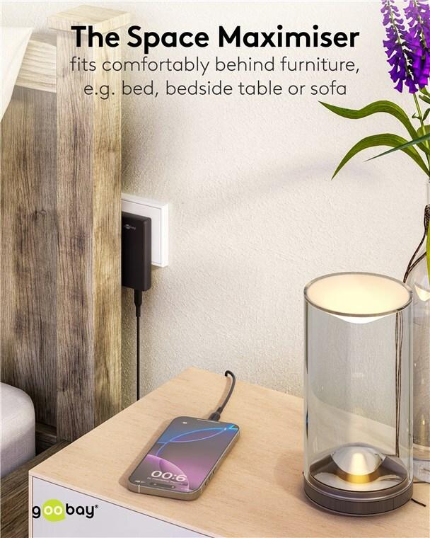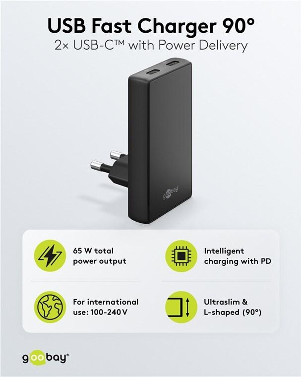 • Goobay USB-C PD GaN Dual-Schnellladegerät 90° Flat 65 W schwarz - 2x -Anschlüsse (75725)