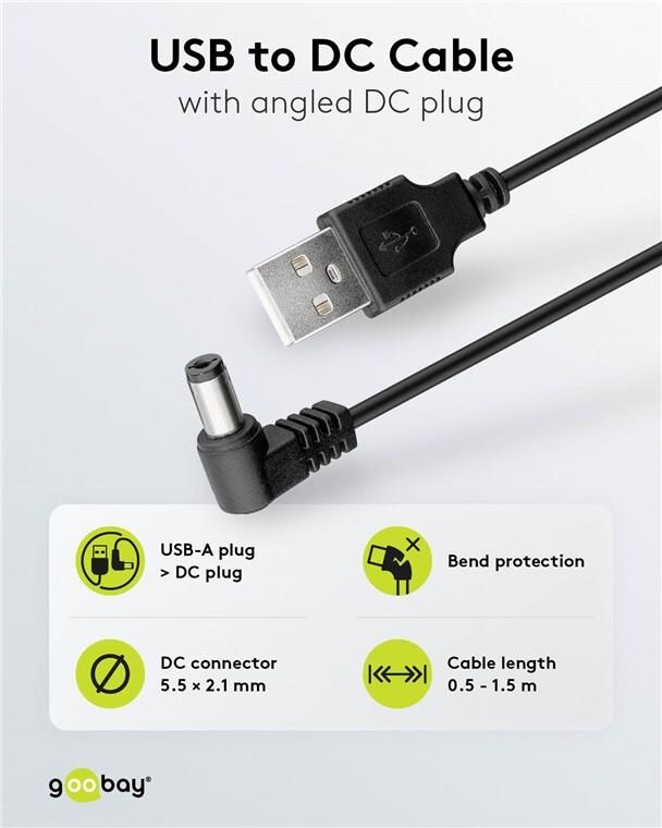 Goobay USB-DC-Kabel 5,5 x 2,1 mm, 0.5 m, Schwarz - für die Stromübertragung von USB-A-Port zu DC-Geräten (55157)