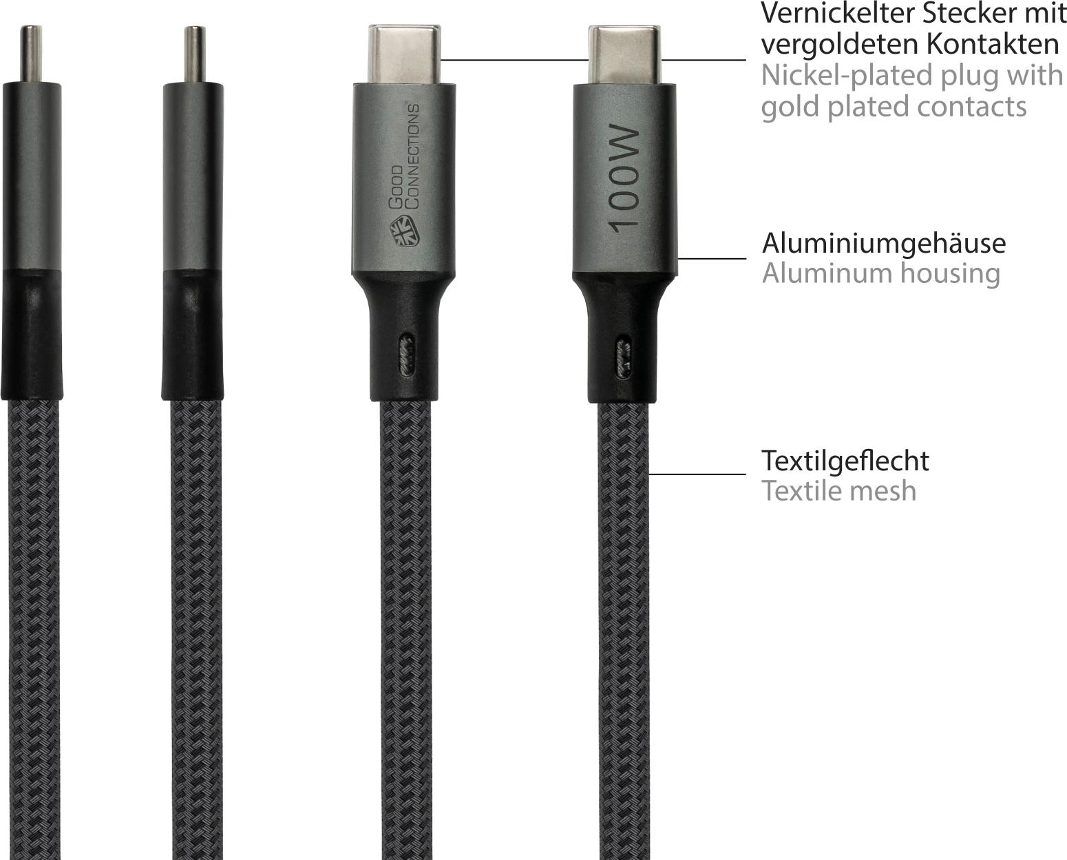 Good Connections USB 4.0 Gen. 2x2 Kabel 20GBit/s 100W 8Ka30Hz USB-C Stecker an - Mit dem hochwertig verarbeiteten und USB-IF zertifizierten USB 4.0 Gen. 2x2 Kabel von Good Connections® können Sie Ihre USB-C™-Geräte nicht nur mit bis zu 100 Watt in kürzester Zeit aufladen - sondern übertragen zeitgleich mühelos und mit beeindruckender Geschwindigkeit von bis zu 20 Gbit/s Daten. Zudem bietet es durch 8K Ultra HD Unterstützung ein erstklassiges Bilderlebnis.<br /> <br /> <b>Hochwertige Verarbeitung und edles Design</b><br /> Das Good Connections® USB 4.0-Kabel ist mit seinem eleganten und robusten Textilgeflecht und seinen stabilen Vollmetallanschlüssen ein stets zuverlässiger Begleiter und ein echter Blickfang. Das herausragend verarbeitete Kabel ist flexibel und stabil zugleich. Ausgewählte - hochwertige Materialien sorgen für eine lange Nutzungsdauer - selbst bei täglichem Gebrauch.<br /> <br /> <b>Universelle Konnektivität und beeindruckende 40-Gbit/s Datenübertragung</b><br /> Dieses High-End USB-Kabel ermöglicht in Verbindung mit USB 4.0 kompatiblen Geräten sehr hohe Datenübertragungsraten von bis zu 20 Gbit/s. Übertragen Sie selbst große Videodateien in kürzester Zeit zwischen verschiedenen Geräten. Selbstverständlich ist es zeitgleich abwärtskompatibel zu den bisherigen USB-Versionen. Machen Sie Schluss mit einer Vielzahl unterschiedlicher Kabel und verbinden Sie mit dem Good Connections® USB 4.0 Kabel mühelos und per Plug-and-Play Ihren Mac - MacBook - iPad - Notebook - Chromebook - Surface und viele weitere USB-C™ Geräte.<br /> <br /> <b>Gestochen scharfe (2402-T005A)