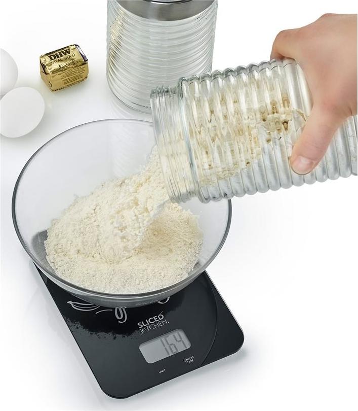 Die digitale Graef Küchenwaage KS202 ergänzt nicht nur ideal Ihre Küchenausstattung, die Küchenwaage ist so dünn, dass die Küchenwaage perfekt unter viele Graef Allesschneider passt. Das Schneiden und grammgenaue Abwiegen der Zutaten kann so direkt in einem Schritt erledigt werden. So ist diese Waage z.B. auch als Diät- oder Diabetikerwaage einsetzbar. Mit einer Tragkraft von bis zu fünf Kilogramm, einer Überlastungsanzeige, einer Abschaltautomatik und der Tara-Zuwiegefunktion ist die kleine Küchenwaage KS202 von Graef der optimale Küchenhelfer. Die Oberfläche der Küchenwaage ist aus Glas in modernem SlicedKitchen-Design gestaltet und so nach der Anwendung einfach und schnell mit einem feuchten Tuch zu reinigen. Die Bedienung der KS202 erfolgt komfortabel über die Sensortasten.