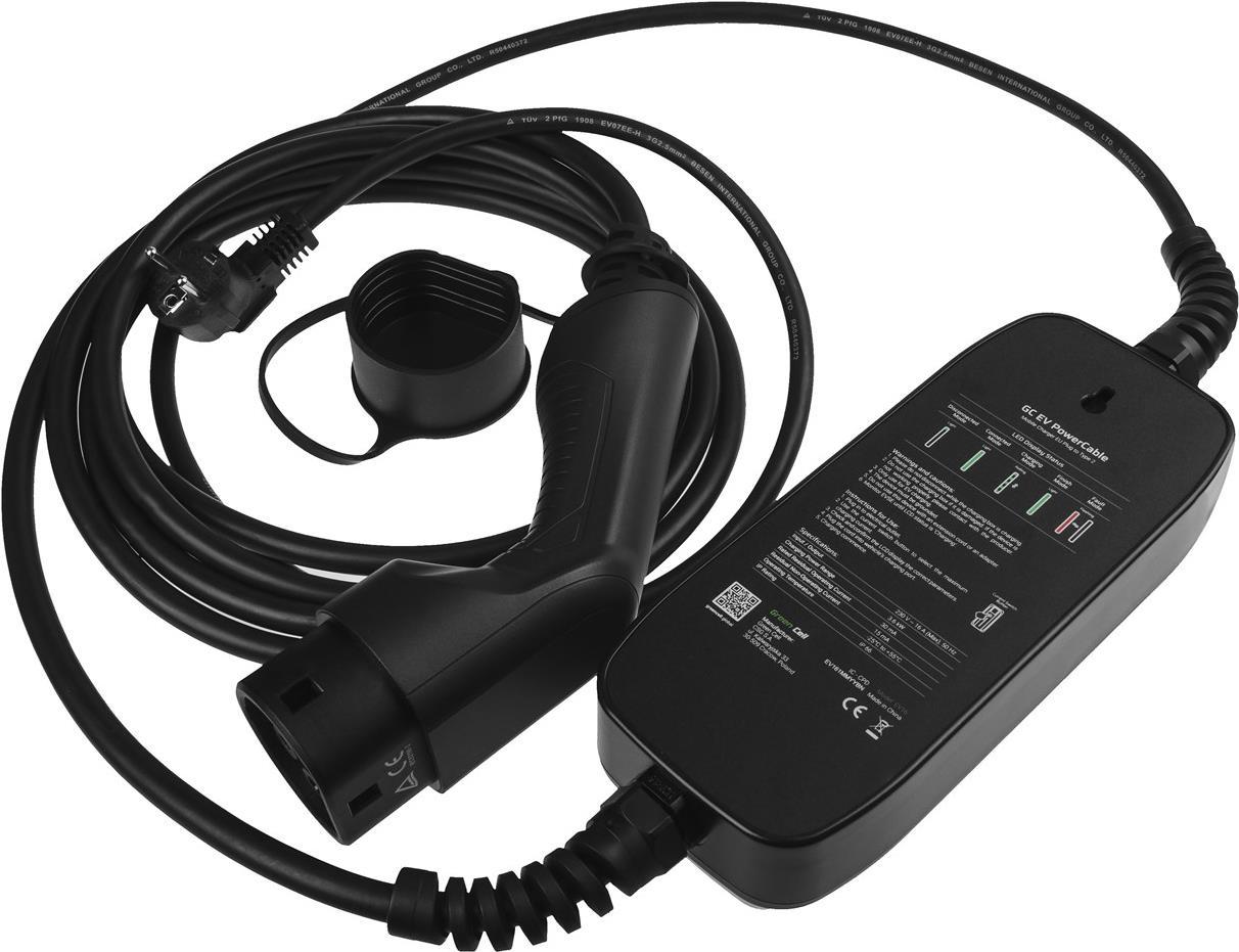 Green Cell EV16. Gehäusefarbe: Schwarz, Bildschirmtechnologie: LCD, Kabelfarbe: Schwarz. Energiequelle: AC, Internationale Schutzart (IP-Code): IP66, Fahrzeug-Anschlussstecker: Typ 2. Einpahsige Ausgangsspannung unterstützt: 230 V, Nennfrequenz: ...