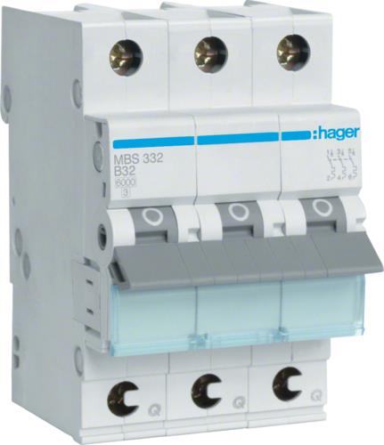 Hager MBS332. Nennstrom: 32 A, AC Eingangsfrequenz: 50/60. Breite: 52,5 mm, Tiefe: 70 mm, Höhe: 83,4 mm (MBS332)