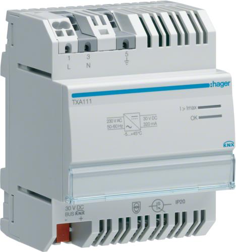 Hager TXA111. Produktfarbe: Grau, Energieschutzeigenschaften: Überlastschutz, Kurzschluß. AC Eingangsspannung: 230 V, AC Eingangsfrequenz: 50/60 Hz, DC-Ausgangsspannung: 30 V. Breite: 72 mm, Tiefe: 64 mm, Höhe: 90 mm (TXA111)