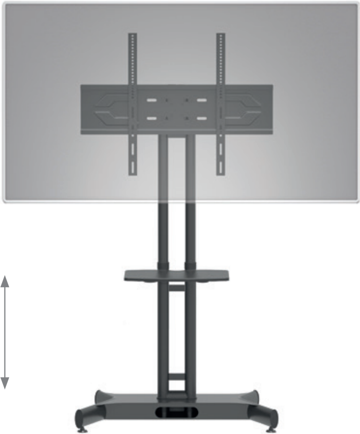 Die Höhe des Bildschirms ist über Raststufen mit Federbolzen entlang der Säulen zwischen min. 1200 und max. 1690 mm variabel (ca. Bildschirmmitte). Die Kabelführung erfolgt innerhalb der Teleskoprohre.