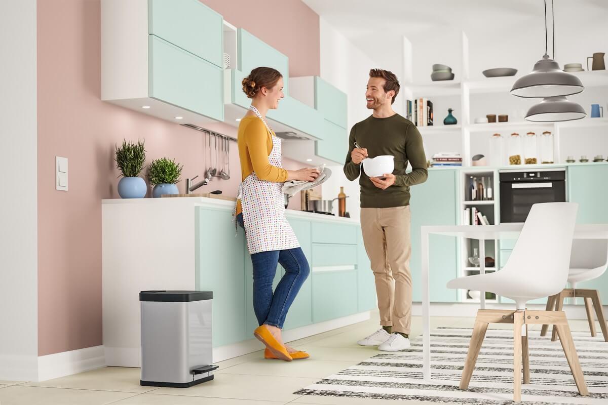 Der Tret-Mülltrenner mit doppeltem Einsatz für die 2-fach-Mülltrennung. Deckel schließt leise (Soft close).