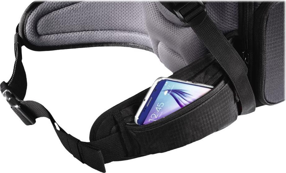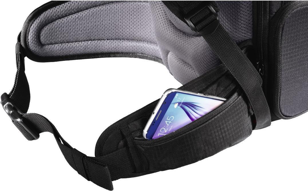 Memory-Karte, interne Netztasche, 2 RV-Hüfttaschen, Akku-Tasche, elastische Seitentasche, gepolstertes Tabletfach, zwei Schlaufen zur Befestigung von Wanderstöcken, 2 x side zippered pocket