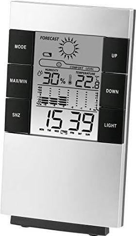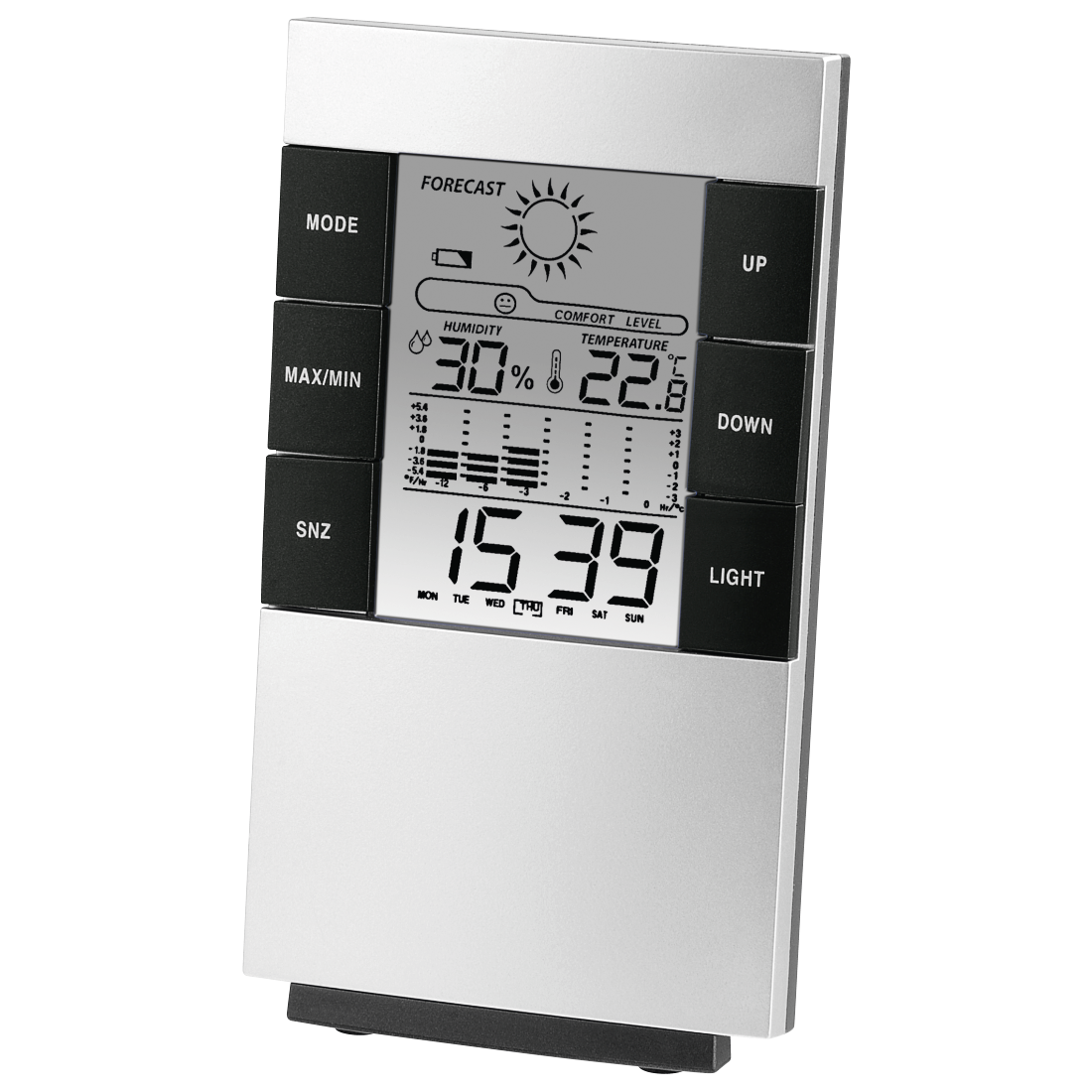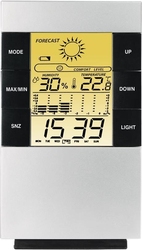 für digitale Anzeige von Temperatur, Luftfeuchtigkeit, Uhrzeit, Wochentag, Datum, Temperaturverlauf und Wettervorhersage
