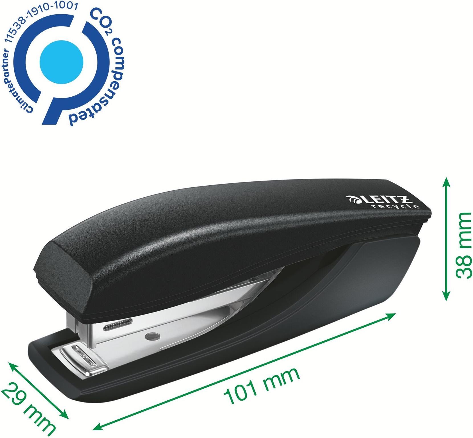Auffälliges, hochwertiges Mini-Heftgerät im handlichen Format aus recyceltem Post-Consumer-Kunststoff für den Einsatz im Büro, zu Hause und unterwegs. Passt in das kleinste Mäppchen oder in Ihre Mappe. Das Produkt ist zu 100% recycelbar, da es vollständig in die verschiedenen Materialtypen zerlegt werden kann. Die patentierte Direct Impact Technologie und die Leitz Power Performance Heftklammern P2 (Nr. 10) sorgen für eine perfekte Heftung bei jedem Einsatz. Dieser handliche Mini-Hefter ist langlebig und die perfekte Ergänzung zu den anderen Produkten der Leitz Recycle Serie. Modernes und zeitgemäßes umweltfreundliches Schreibtischzubehör, das zu Hause und im Büro großartig aussieht. Mit der neuen umweltfreundlichen Recycle Serie von Leitz können Sie Ihr Arbeitsumfeld umweltfreundlicher gestalten und mehr zum Schutz unseres Planeten tun.