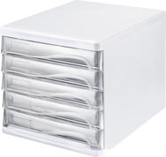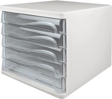 helit Schubladenbox, 5 Schübe, lichtgrau/glasklar aus Polystyrol/ABS, stapelbar, mit Griffmulde zum Einfachen (H6129402)