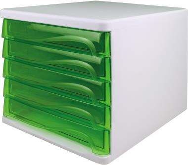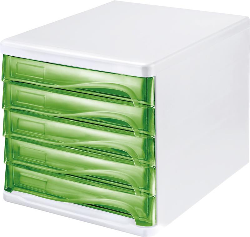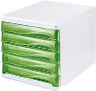 helit Schubladenbox, 5 Schübe, lichtgrau/grün-transparent aus Polystyrol/ABS, stapelbar, mit Griffmulde zum Einfachen (H6129450)