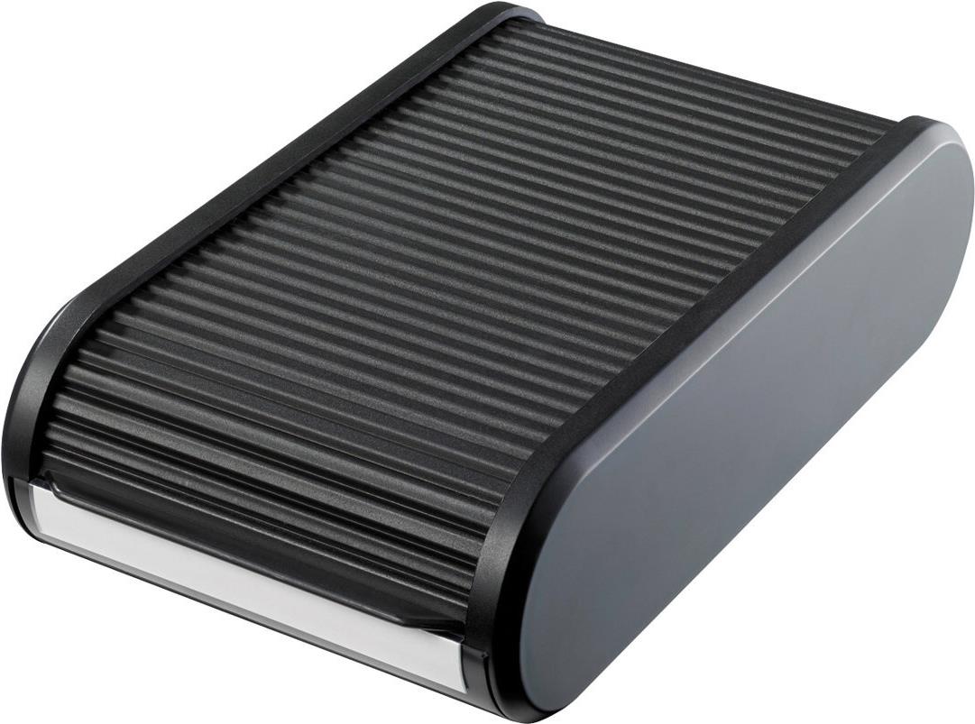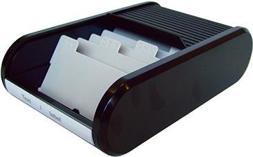 helit Visitenkartenbox Linear, schwarz 8-teilige alphabetische Unterteilung, schwarzer Rollover- schluss, für ca. 300 Visitenkarten in DIN A8, mit Gummifüßen, Maße: (B)136 x (T)240 x (H)67 (H6218095)