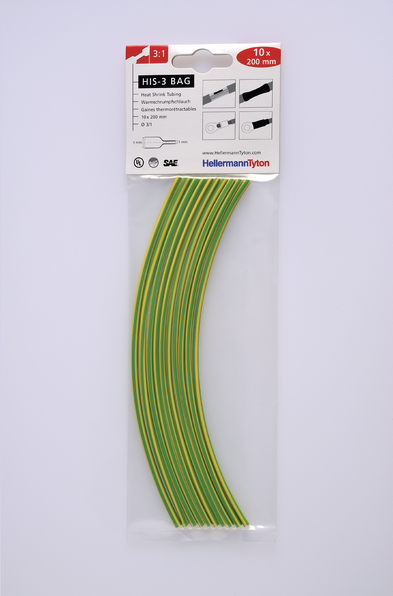 Warmschrumpfschlauch 3:1 (6/2 mm), grün-gelb, 200 mm (10 Stk.)10 mDünnwandiger und flexibler Warmschrumpfschlauch aus strahlenvernetztem Polyolefin mit der Schrumpfrate 3:1. 10 vorgeschnittene Schläuche à 200 mm. Kleinverpackun