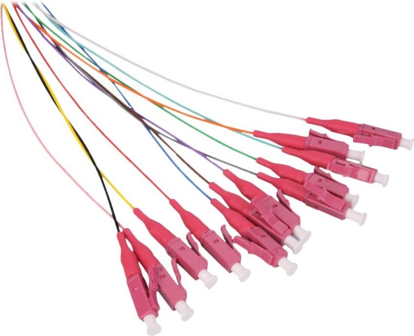 Helos Faserpigtail 12 x LC OM4 50/125µm, easy strip, 2,0m ?900 u halogenfree outer Jacket ?Cable OD:0.9mm±0.05 ?OM4 50/125um ?For 10 Gbit Ethernet ?with ceramic Ferrule and boot ?UPC Polish ?Cable color:1.blue,2.orange, 3.green, 4.brown,5.grey, ...