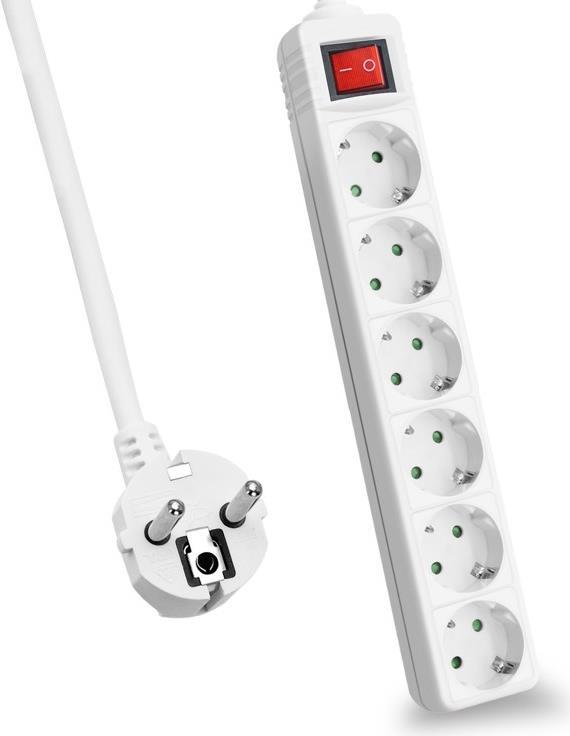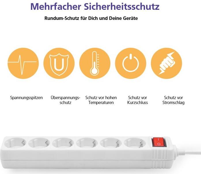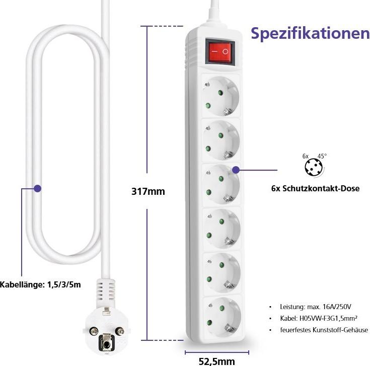 Helos Steckdosenleiste CLASSIC, 6-fach, weiß, 1,5m, mit Schalter Robustes klassisches Design , 1,5m Zuleitung , Leiterquerschnitt: 1,5 mm² , Kabeltyp: H05VV-F 3G1.5mm , mit Schalter , 6 Schutzkontaktsteckdosen 45° gedreht , mit Berührungsschutz ...