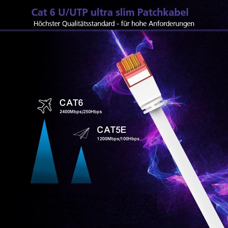 Helos ultra slim Patchkabel U/UTP Cat 6 weiß 10,0m ultra flaches Patchkabel für Verwendung bei beschränkten Raumverhältnissen , Premium Qualtät , U/UTP, ungeschirmt , mit Rastnasenschutz , AWG 32 , Strapazierfähig , vergoldete Kontakte (263023)