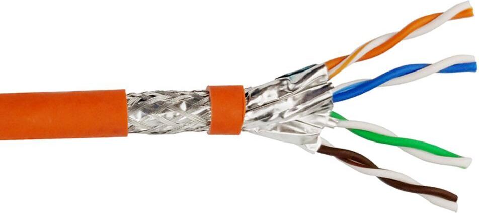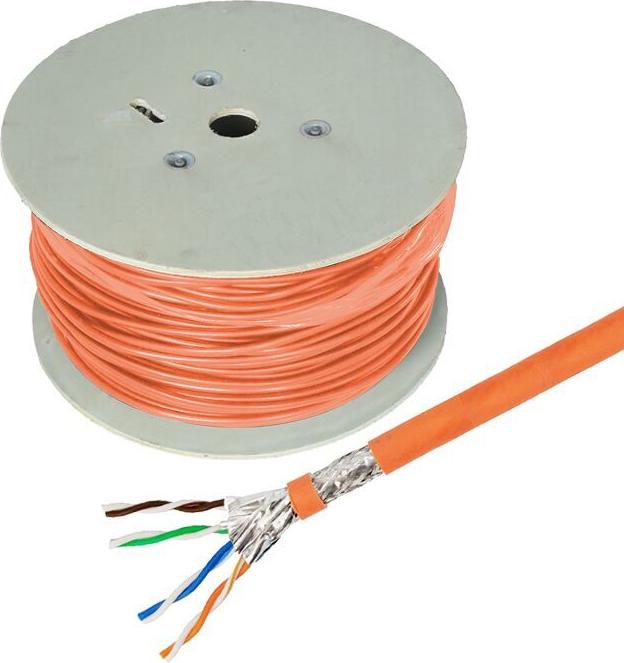 Helos Verlegekabel High Quality,Cat.7 Rohkabel, S/FTP, PiMF, LSZH, orange, 500m Trommel -Cat.7 Rohkabel, 600MHz - paarweise und Gesamtabschirmung (PimF) - 4 x 2 x AWG 23/1 - Außendurchmesser: ca. 7,6mm - halogenfrei (LSZH) - Farbe: orange - CPR-Eca-zertifiziert - ROHS 2.0 & REACH Compliant - 500m Trommel (263842)