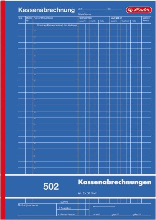 herlitz Formularbuch \"Kassenabrechnung 502\", DIN A4 ------------------- für den Markt: D ----------------------- 2 x 50 Blatt, 1. Blatt weiß, 2. Blatt rosa, Papier holzfrei, mit Durchschreibepapier (Kohlepapier), perforiert, 1. Blatt gelocht (00882415-001)